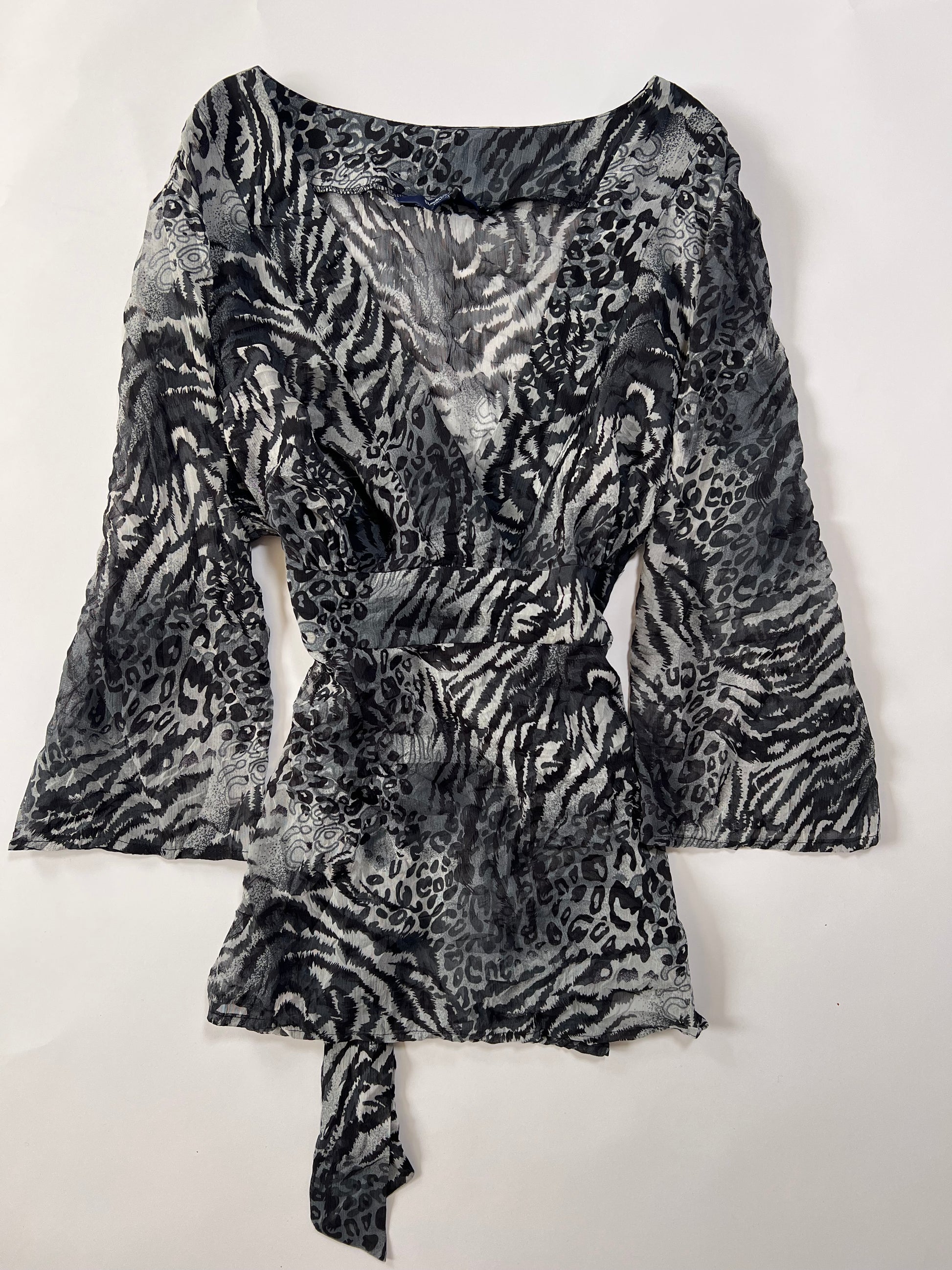 Gorgeous animal-print blouse with a V-neckline, bell sleeves, and tie-back detailing for a flattering fit.