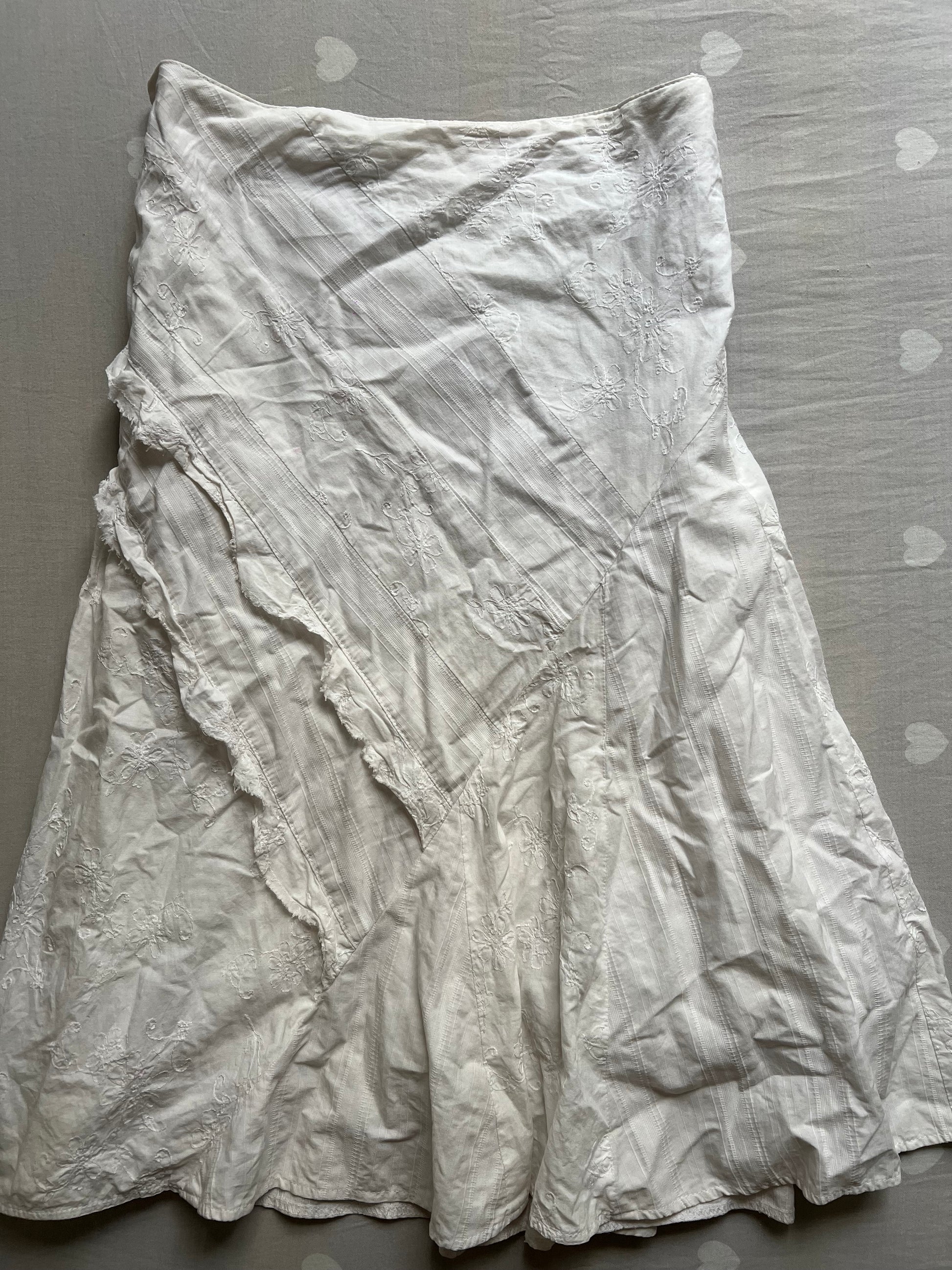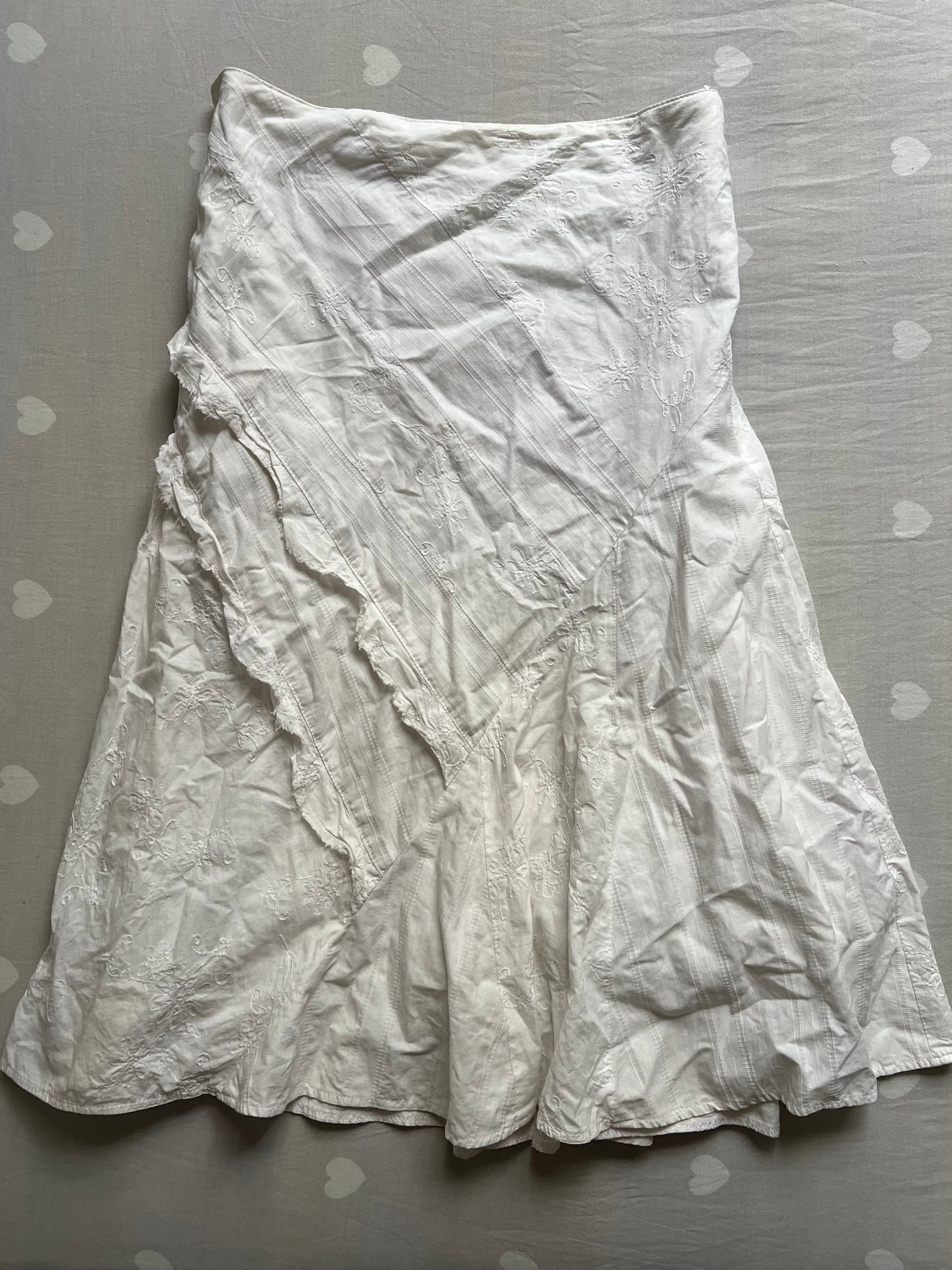 Description: asymmetrical white cotton midi skirt with ruffles and embroidery deets.