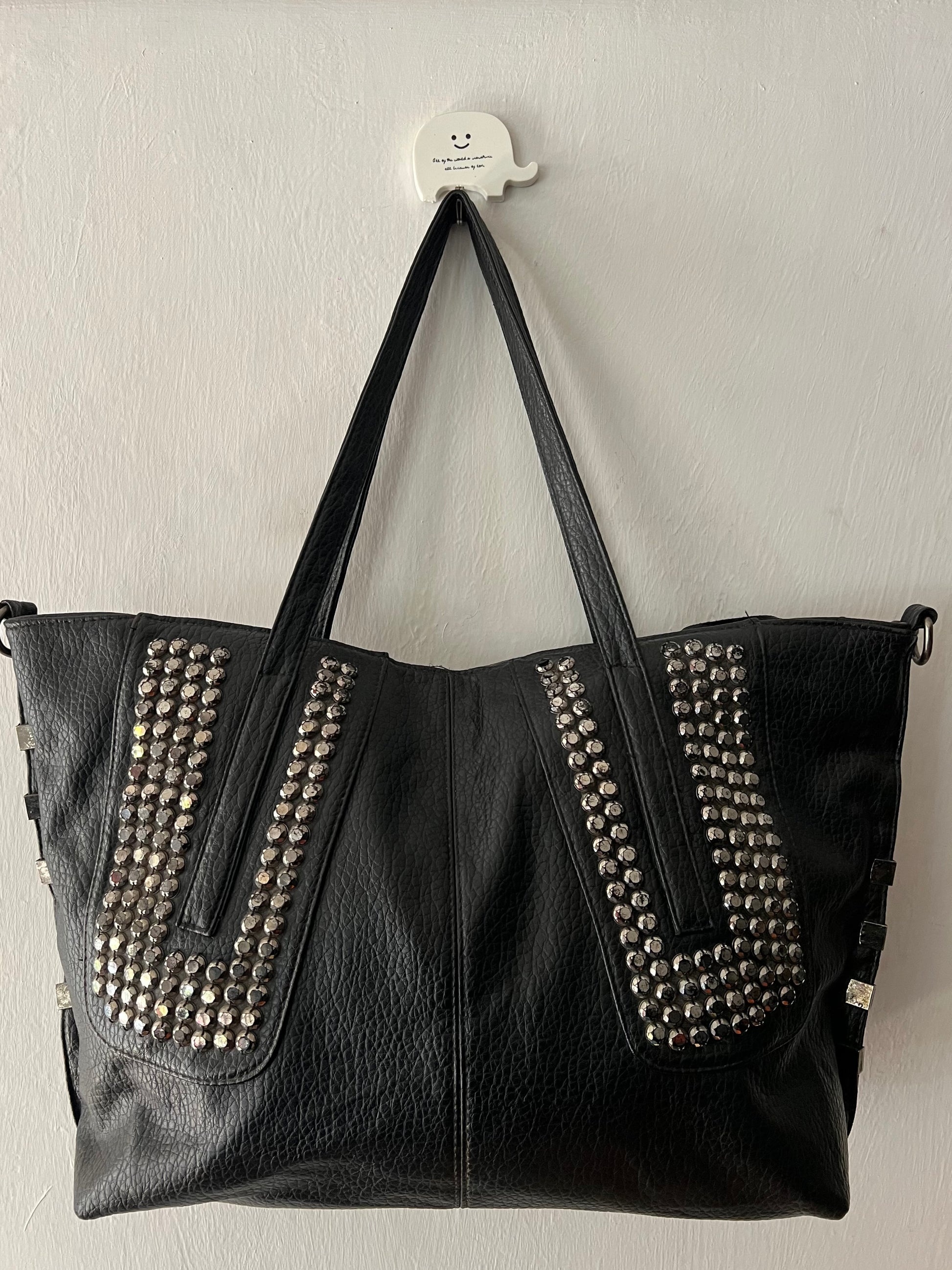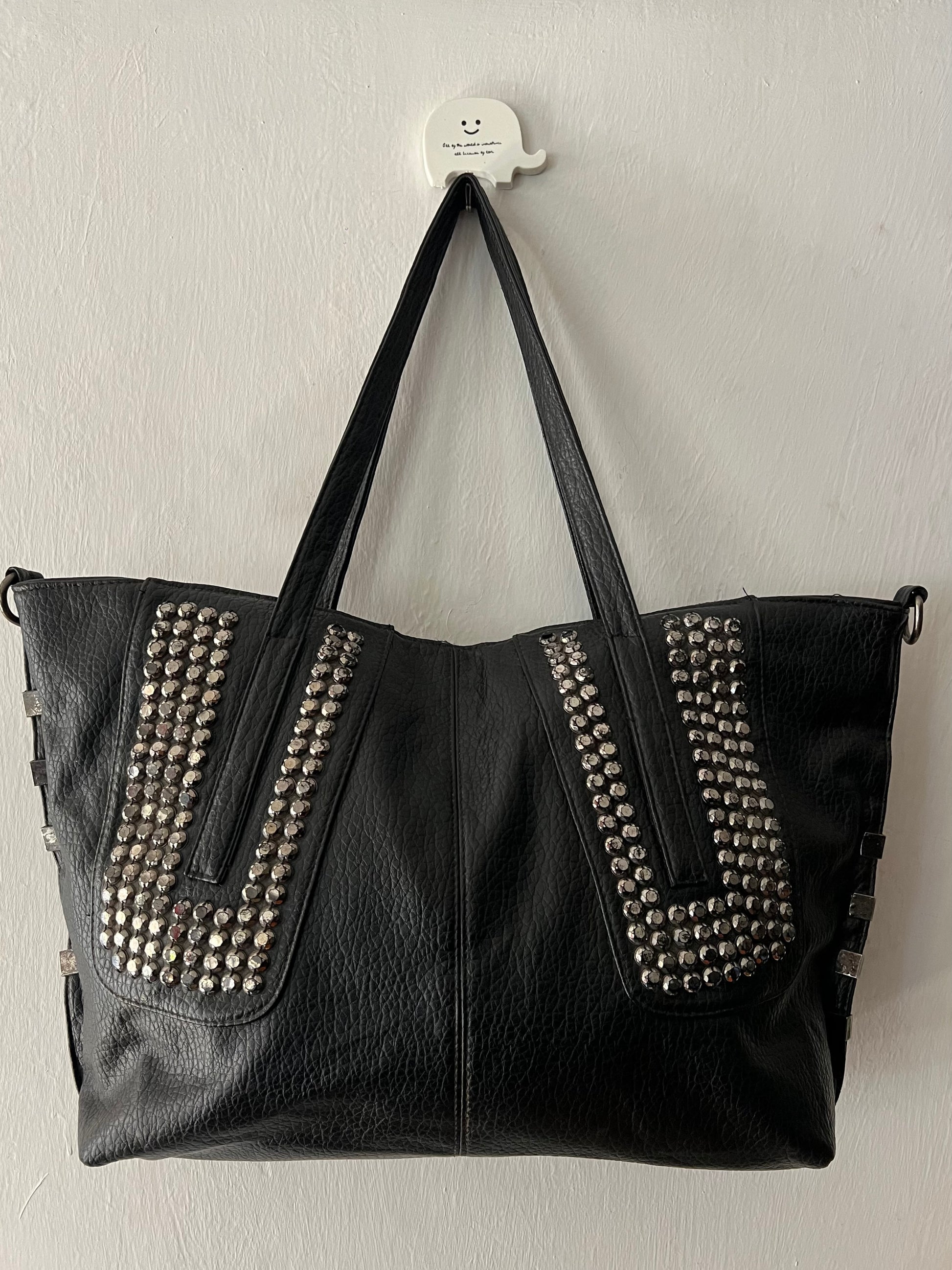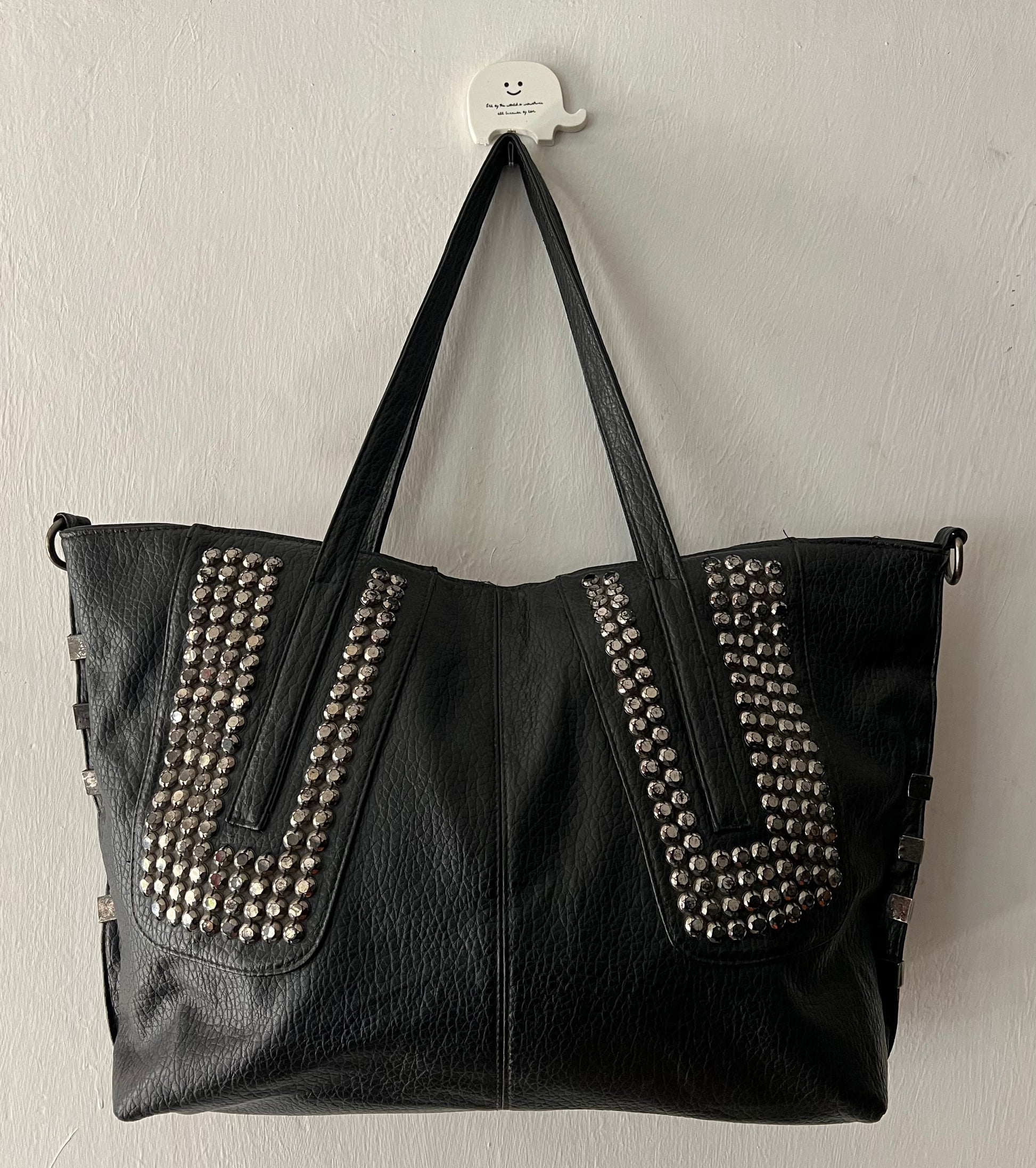 Description: This striking black leather tote showcases eye-catching studded embellishments. Spacious enough for everyday essentials and travel needs, it combines practicality with bold style. The single compartment design allows for lots of items, while a secure zip closure ensures your belongings stay protected.