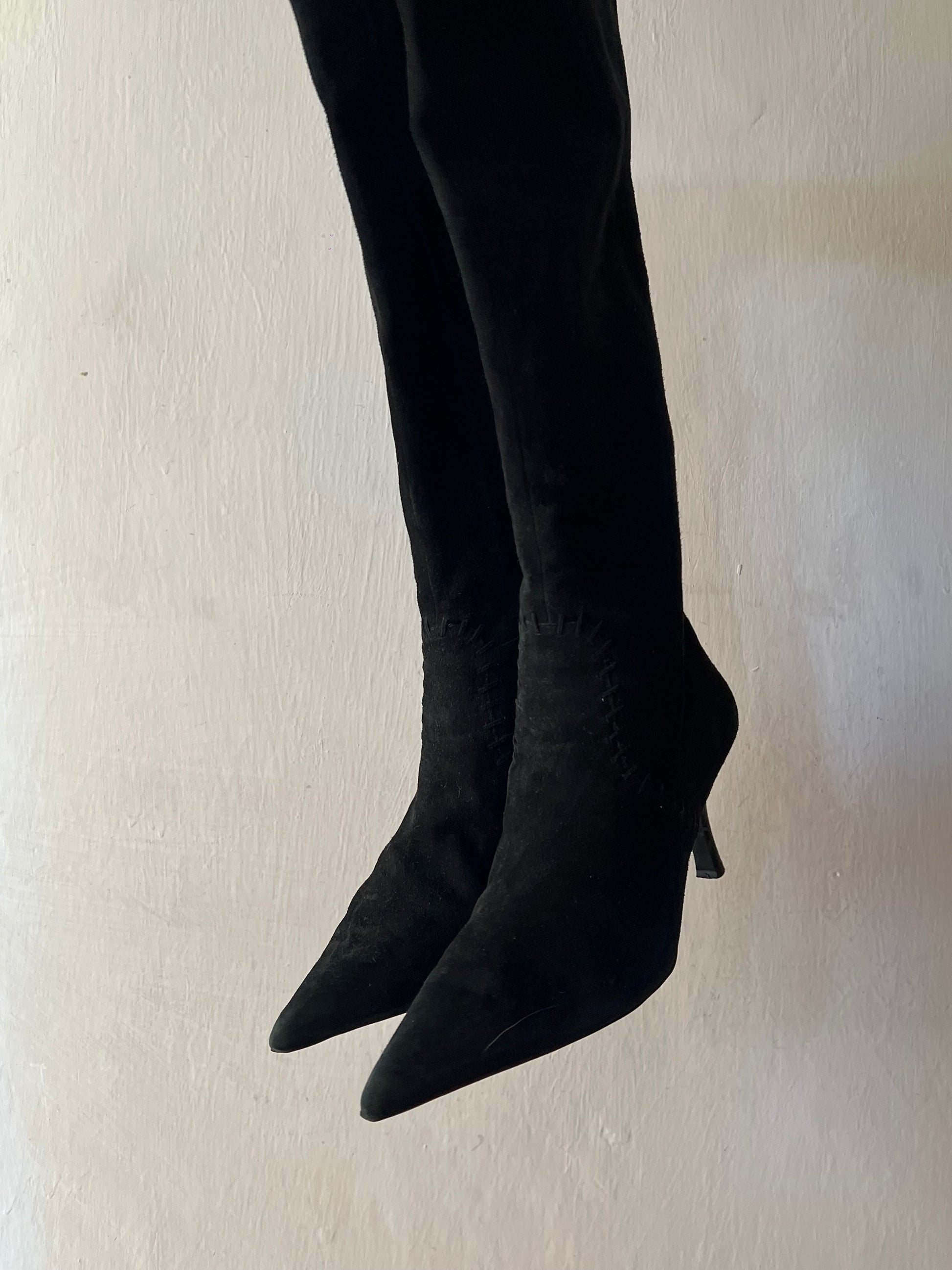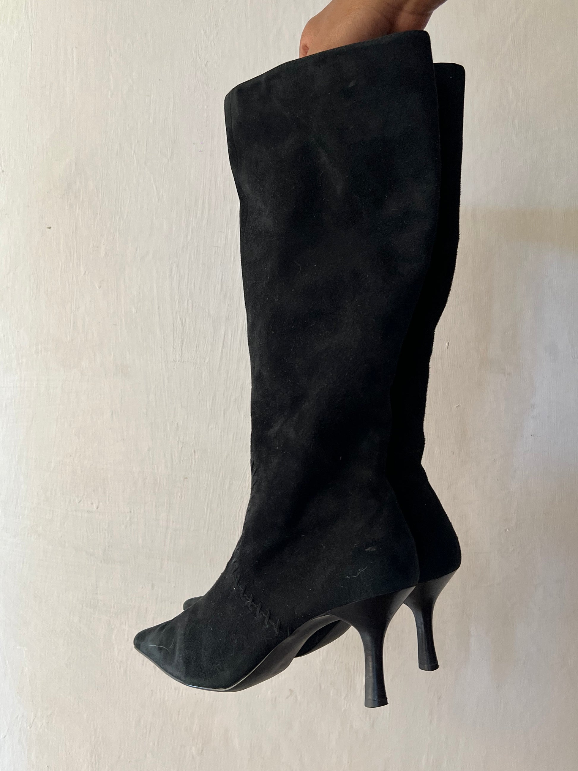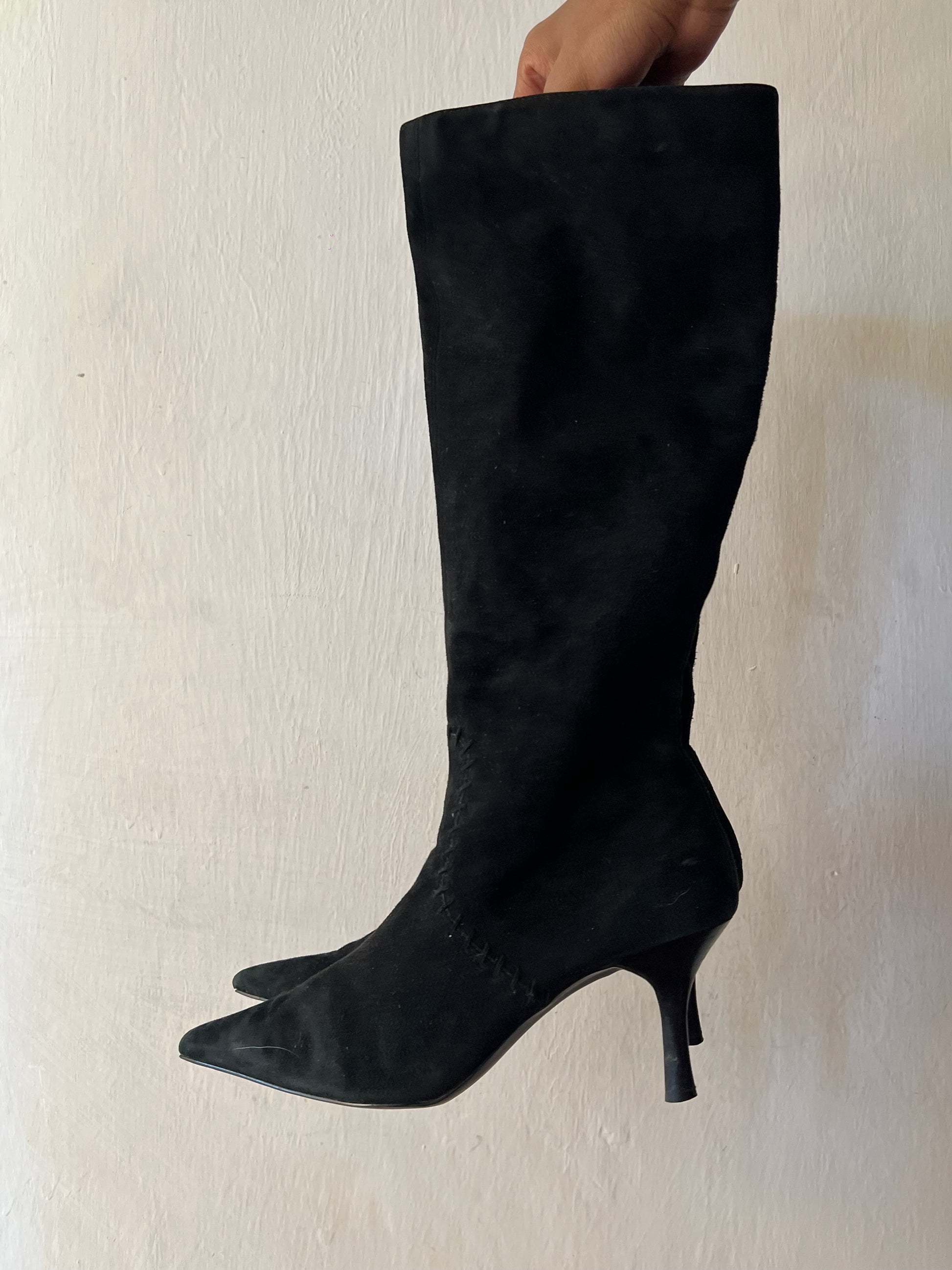 Black pointy toe knee high boots