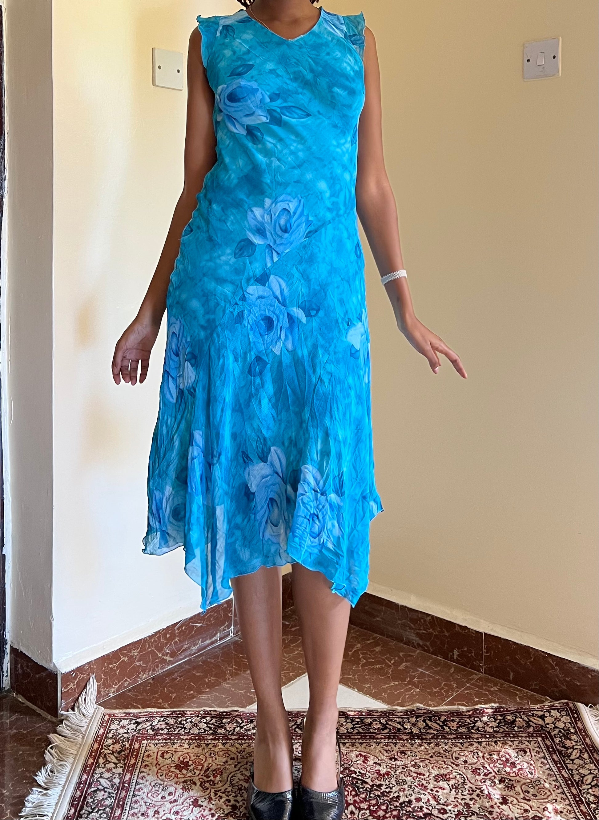 Rare vintage late ’90s cocktail dress in vibrant blue with a floral print