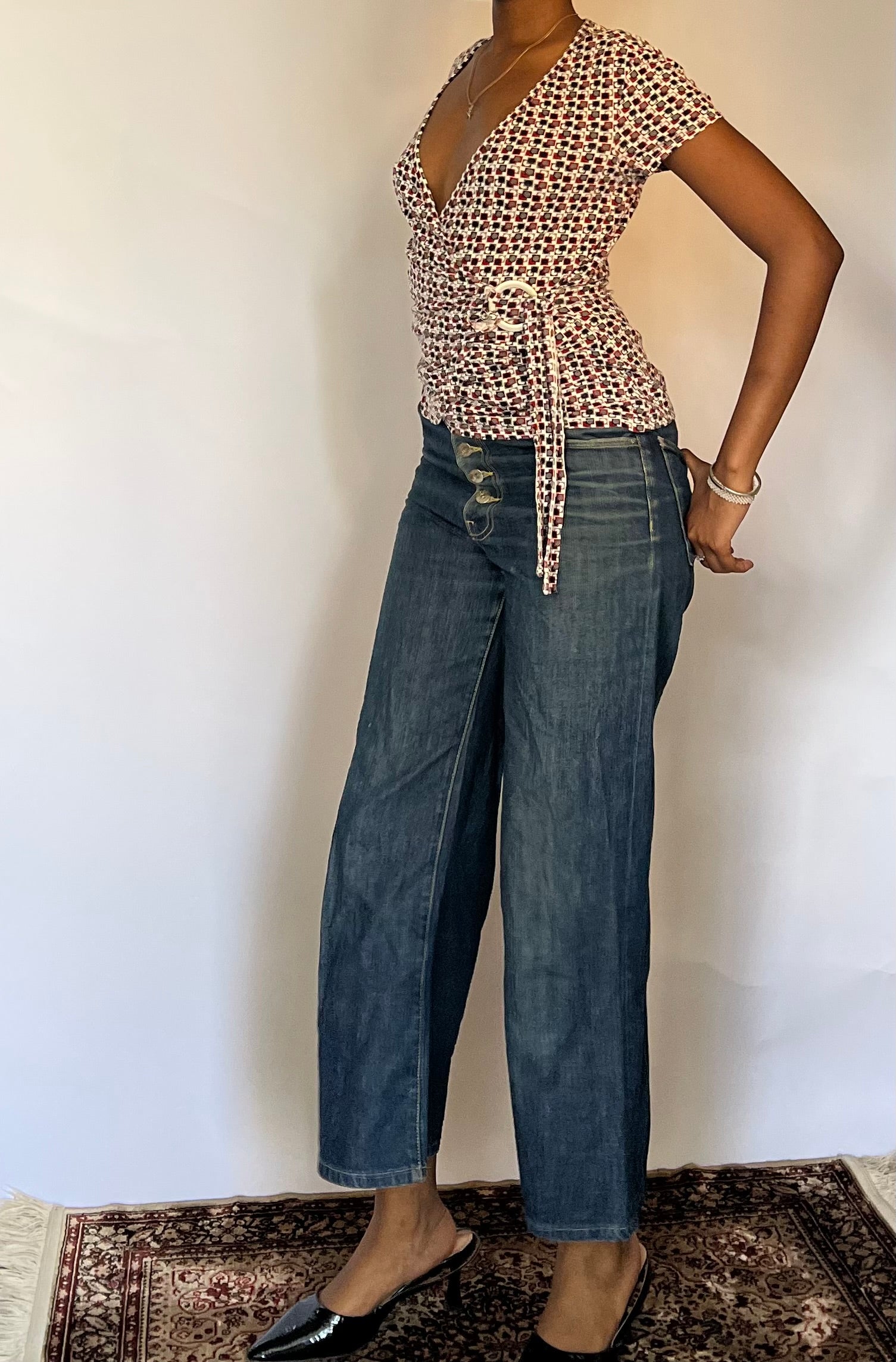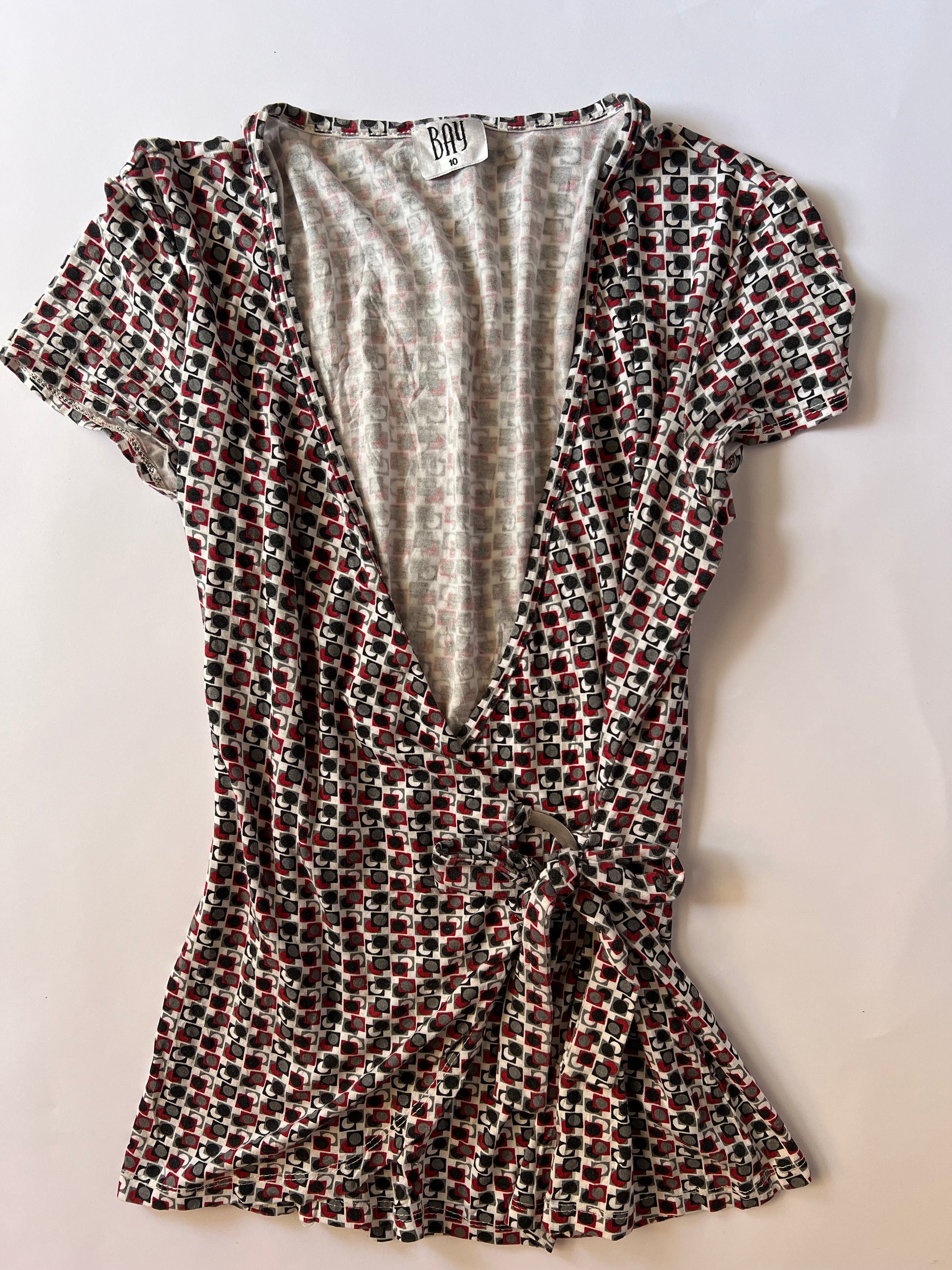 Geometric-print jersey wrap top with a flattering V-neckline and silver hardware buckle.
