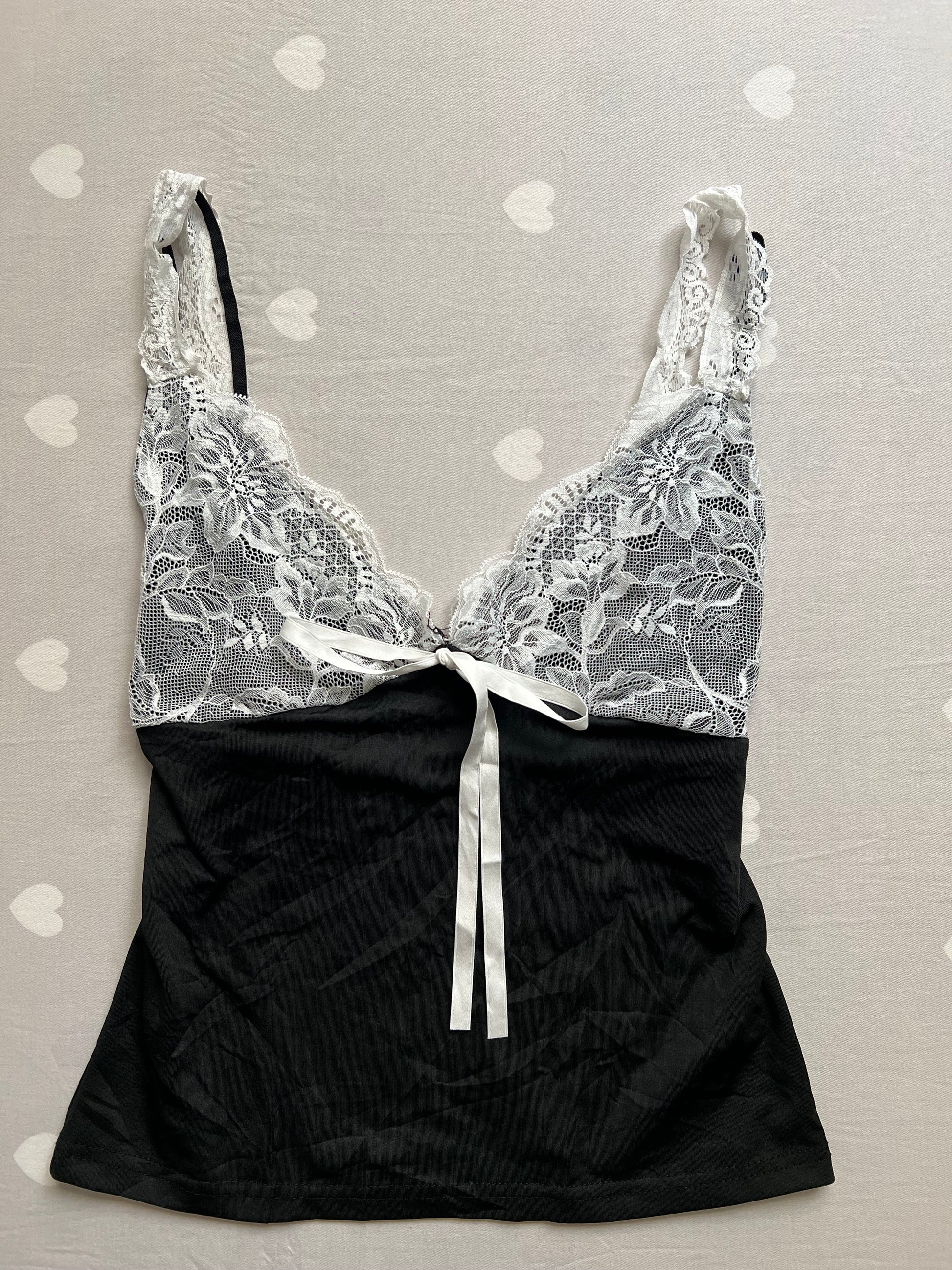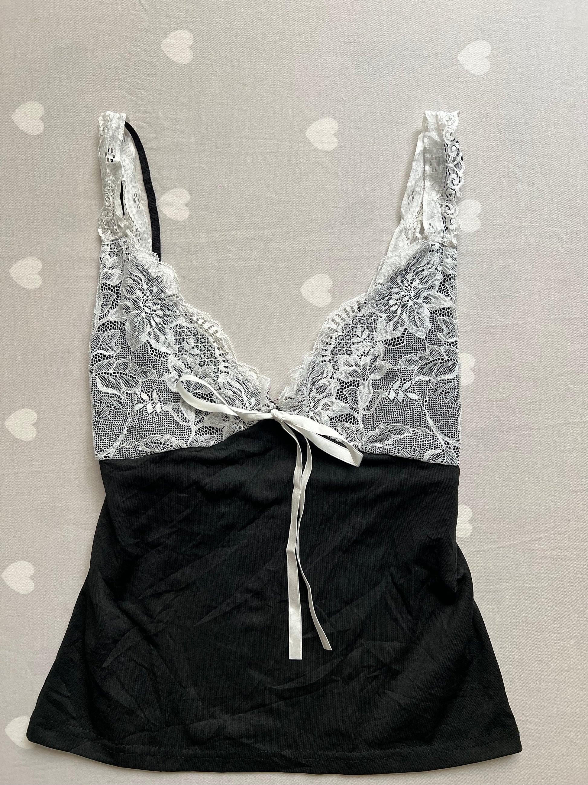 Beautiful black coquette cami with white lace trims on the bust and strap area