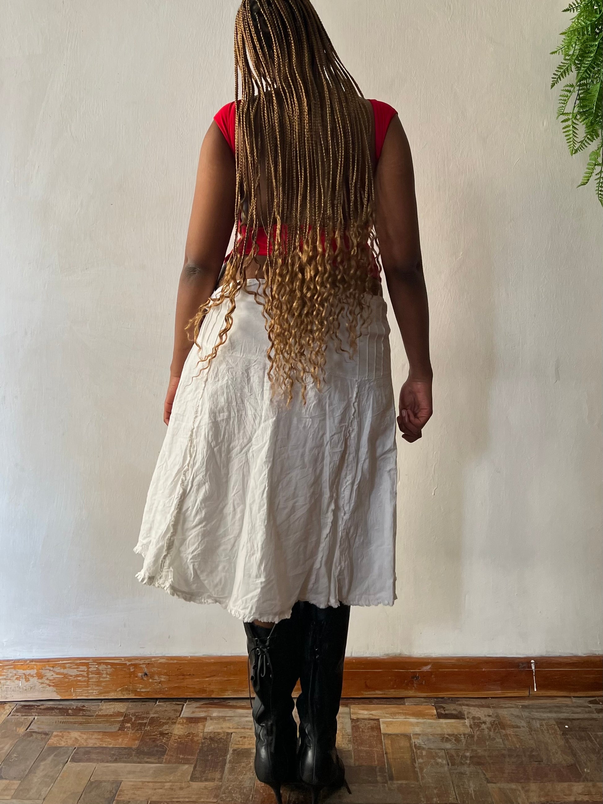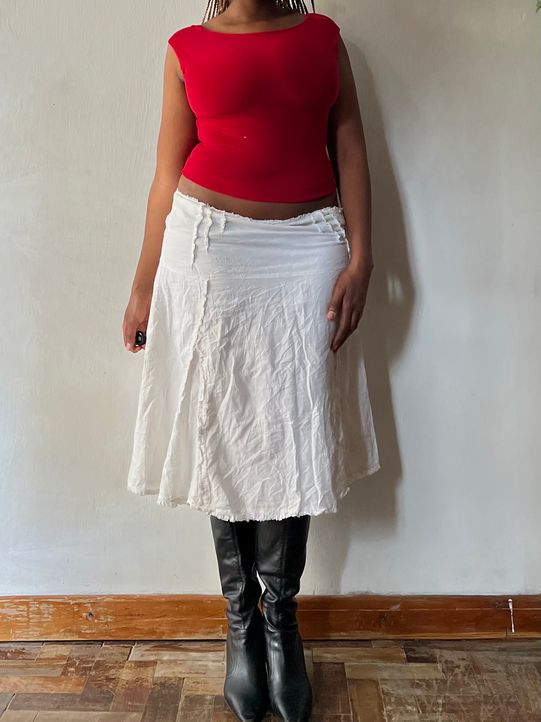 Description: 100% cotton A-line maxi skirt with frayed seams