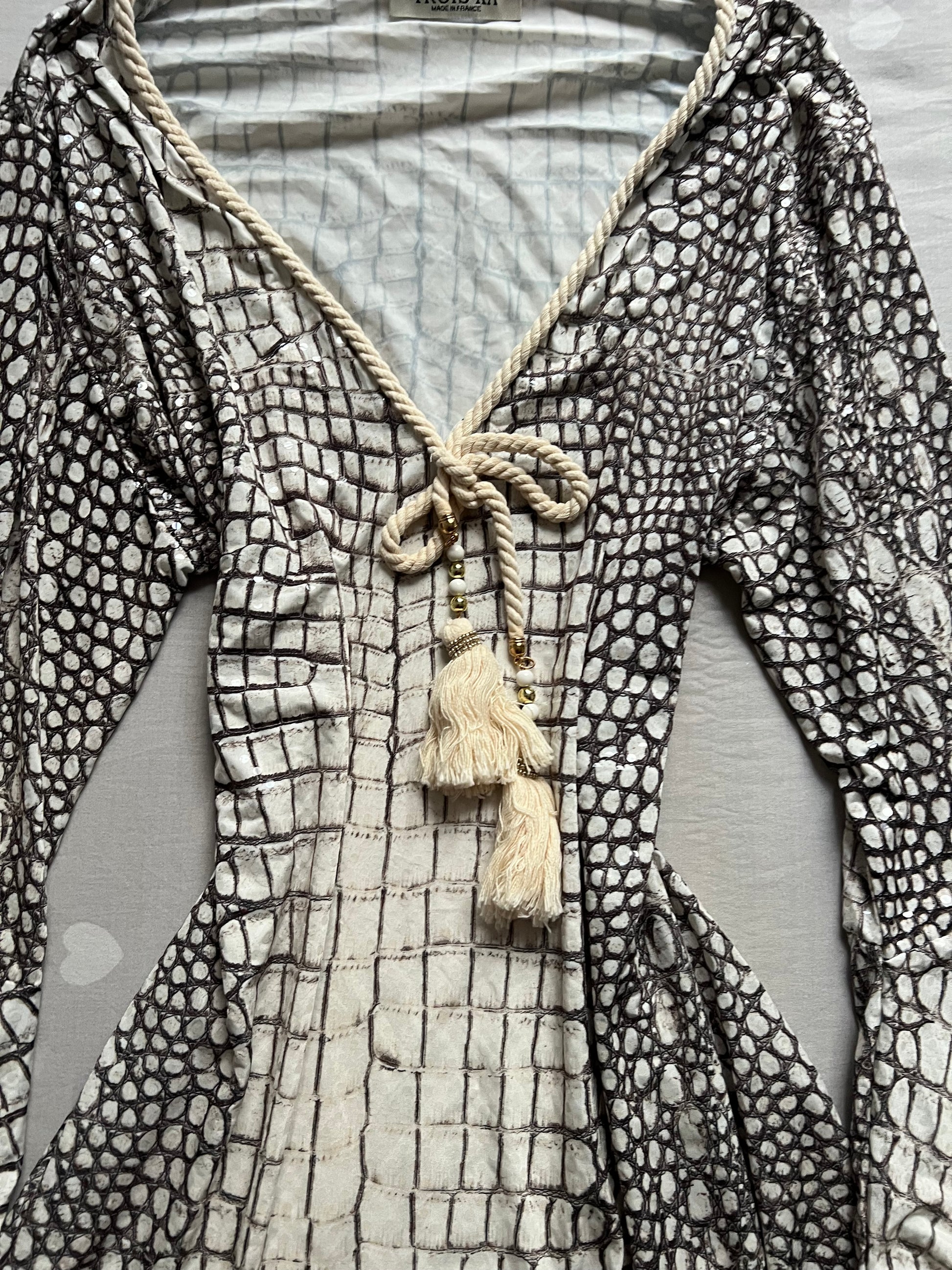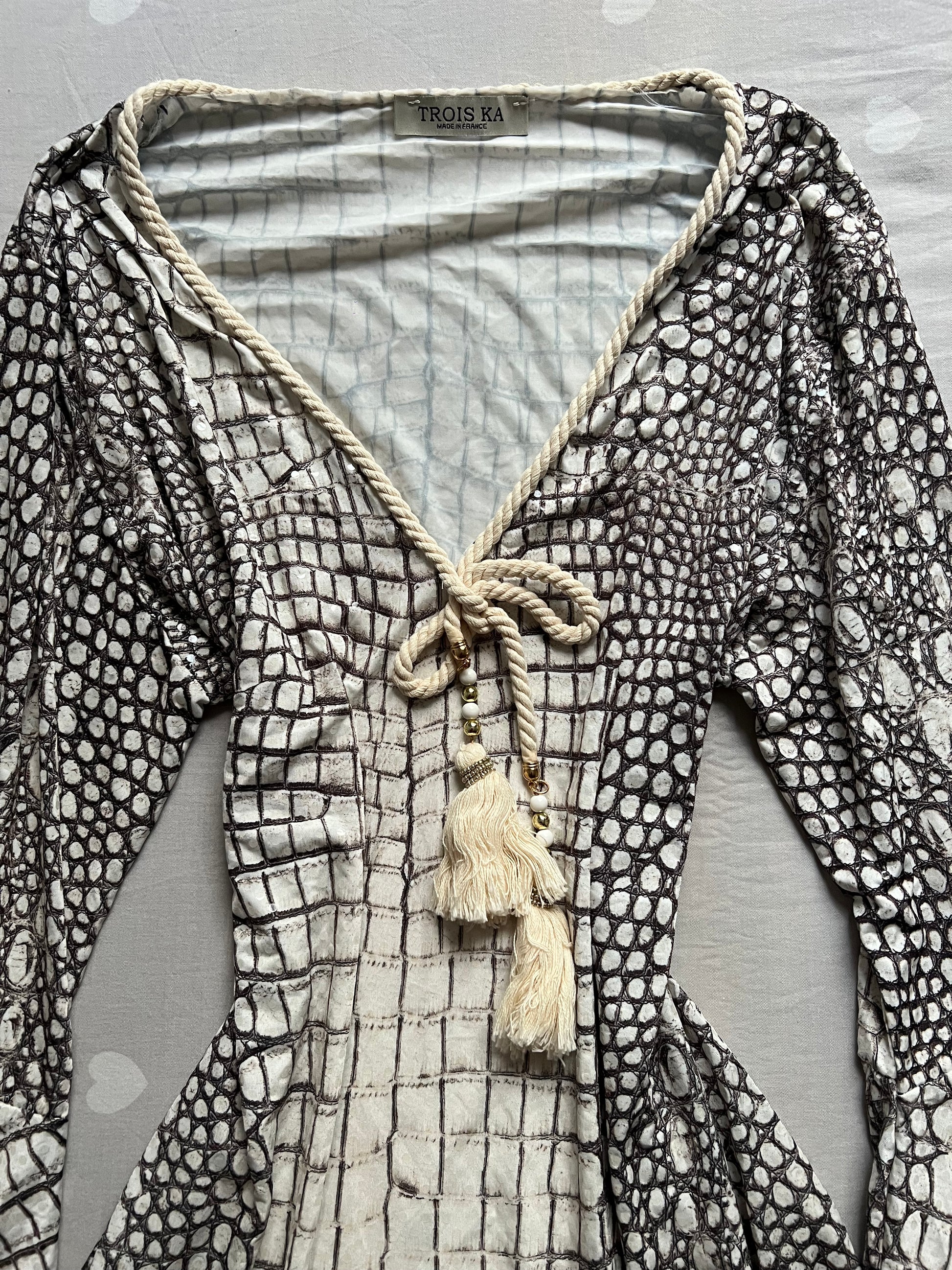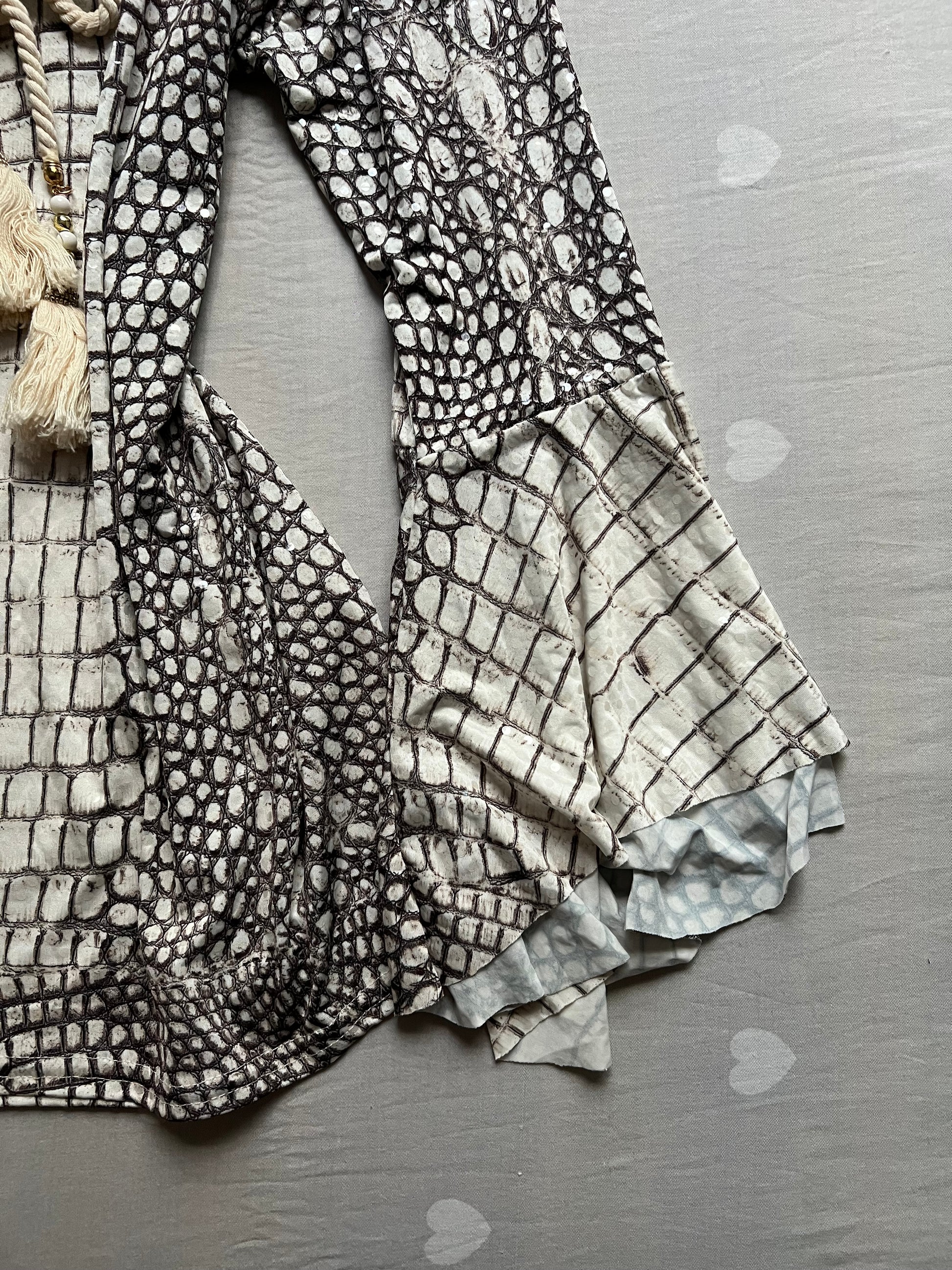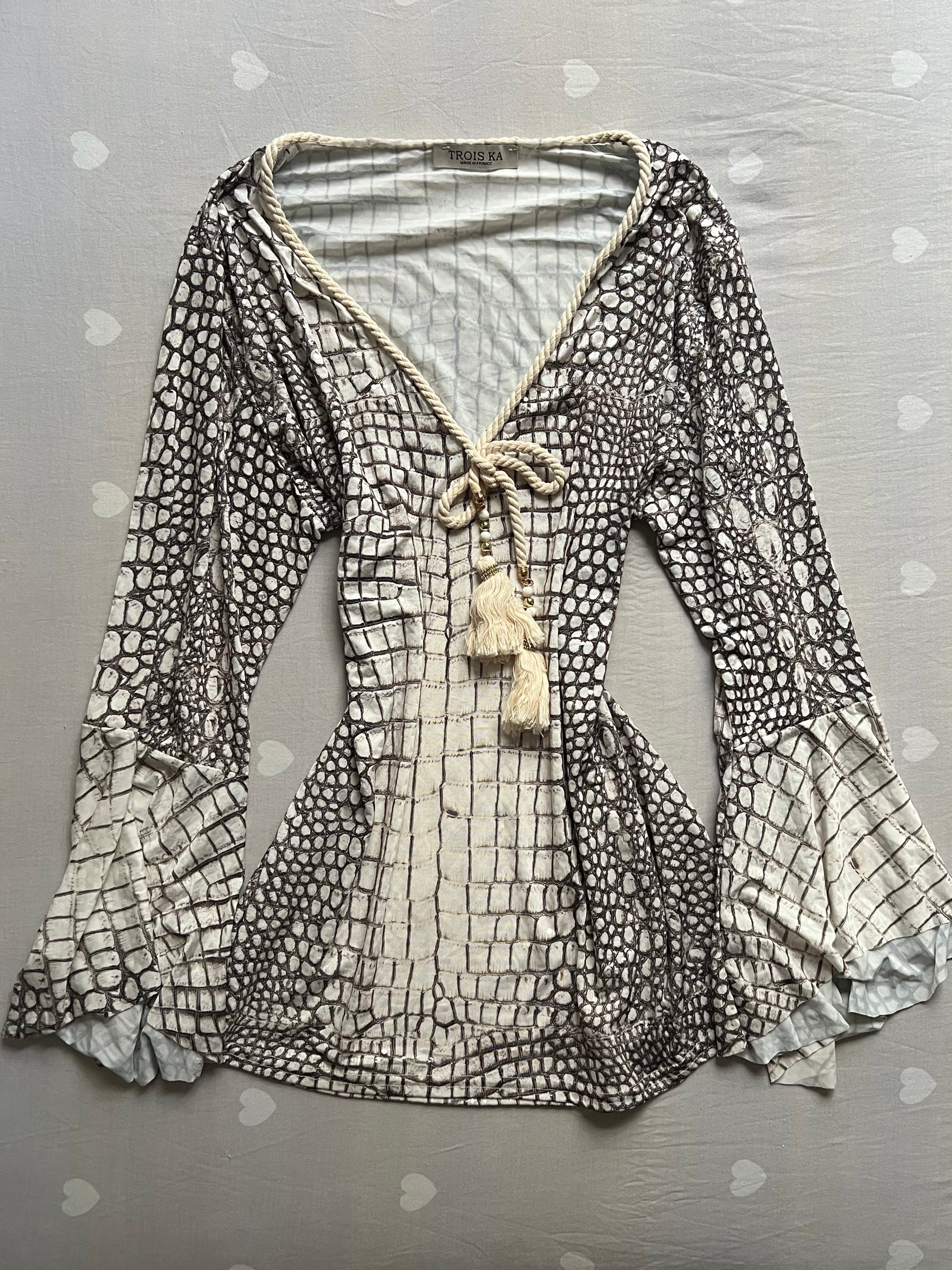 Description: distinct crocodile print, bell sleeves, tassel tie detail, v neck shape