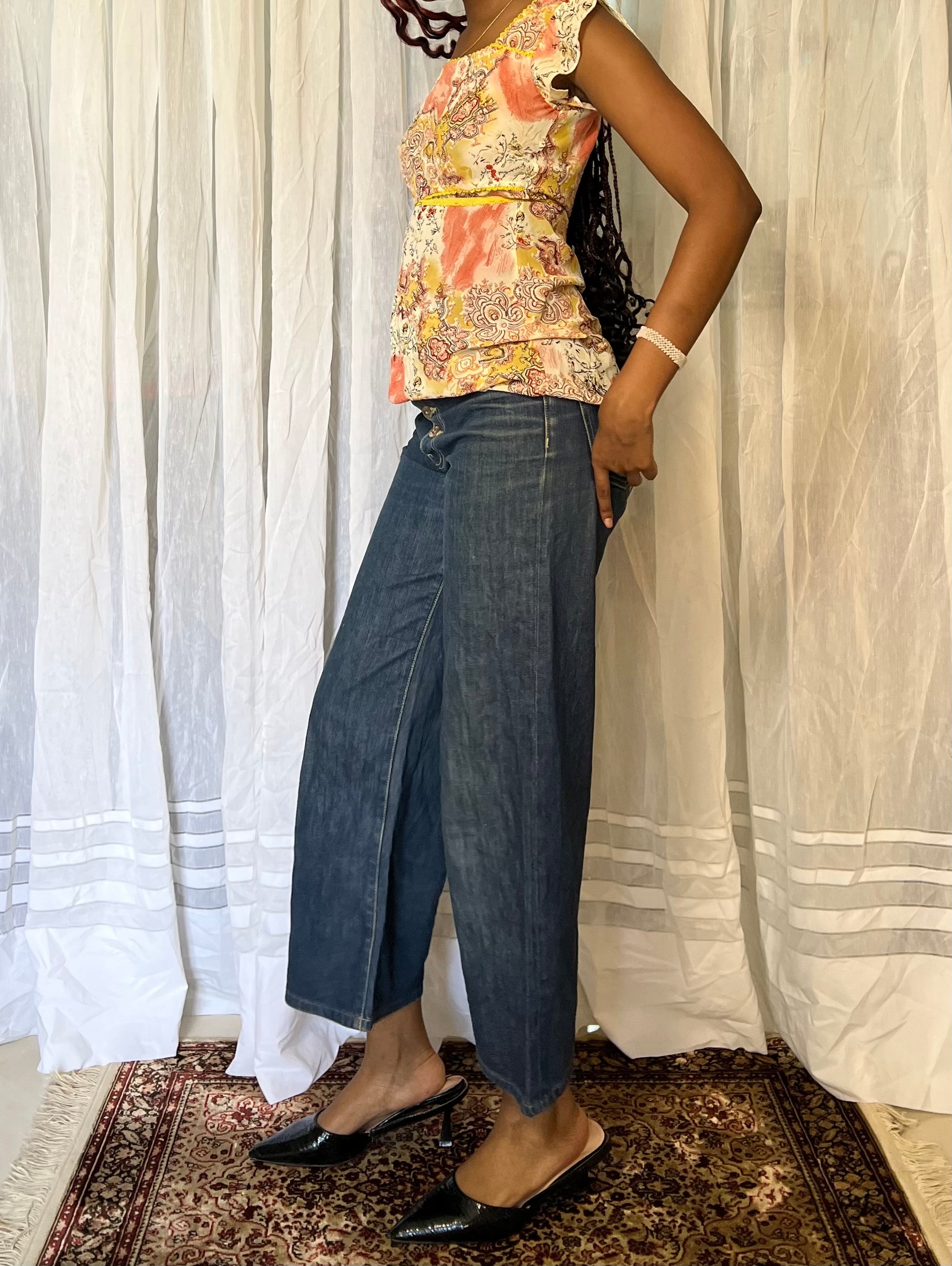 Floral summer dress/top in pink, orange, and yellow hues with an asymmetrical hem and flattering baby doll waist. Flowing, playful, and perfect for sunny days.