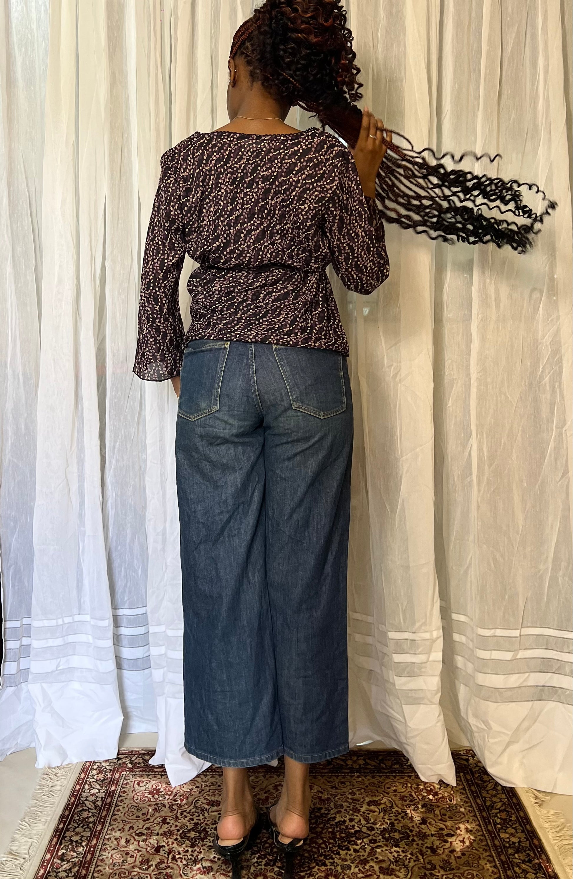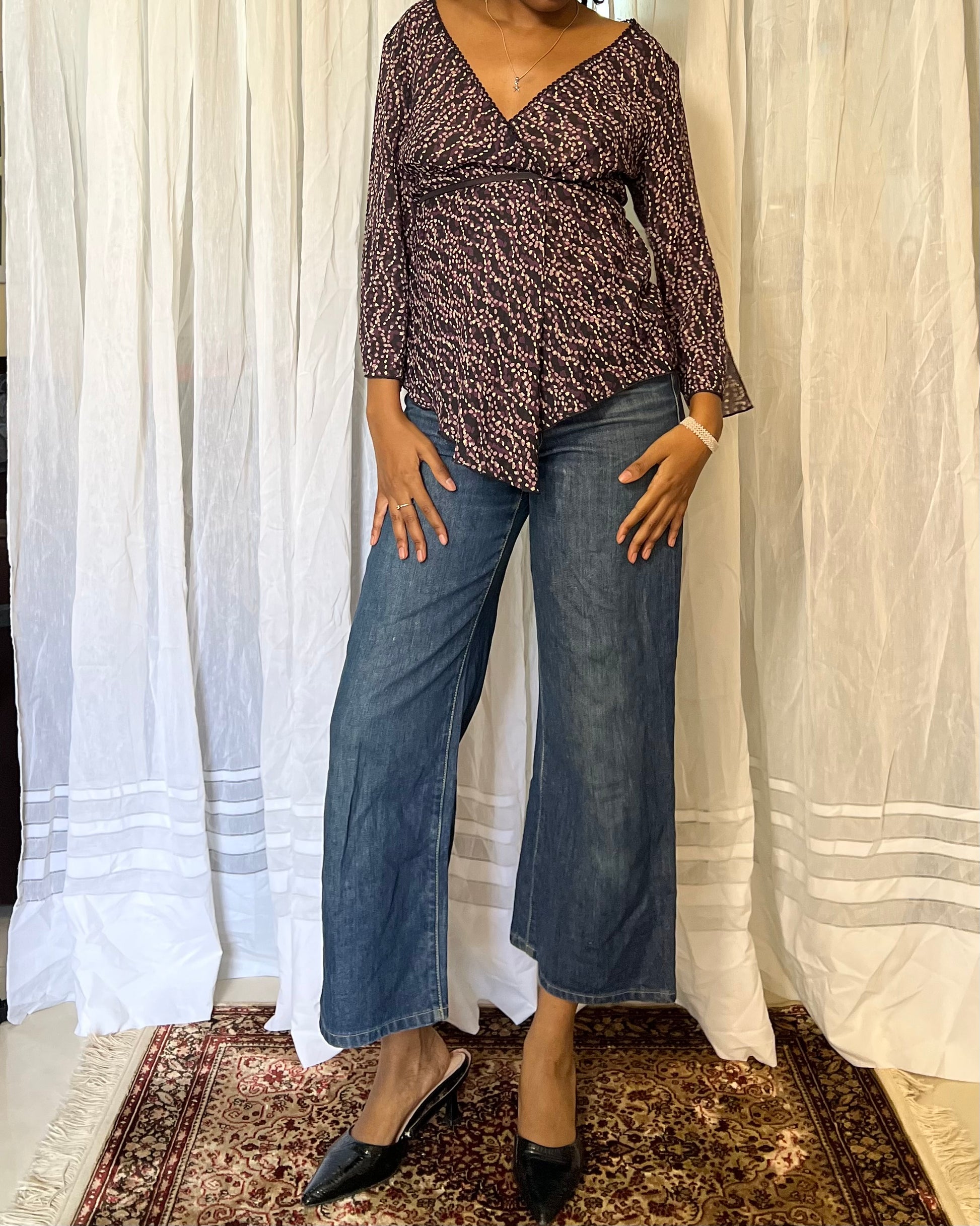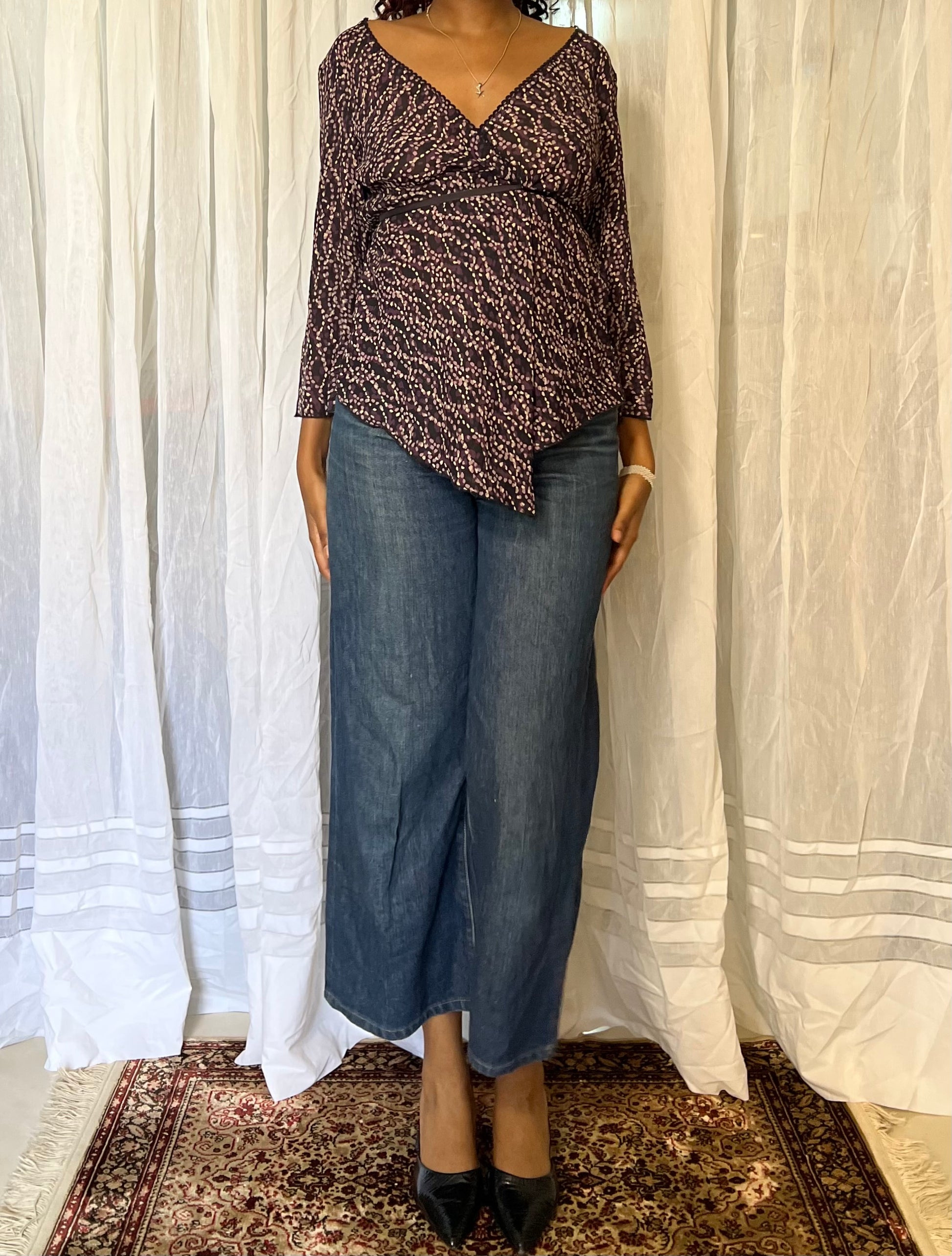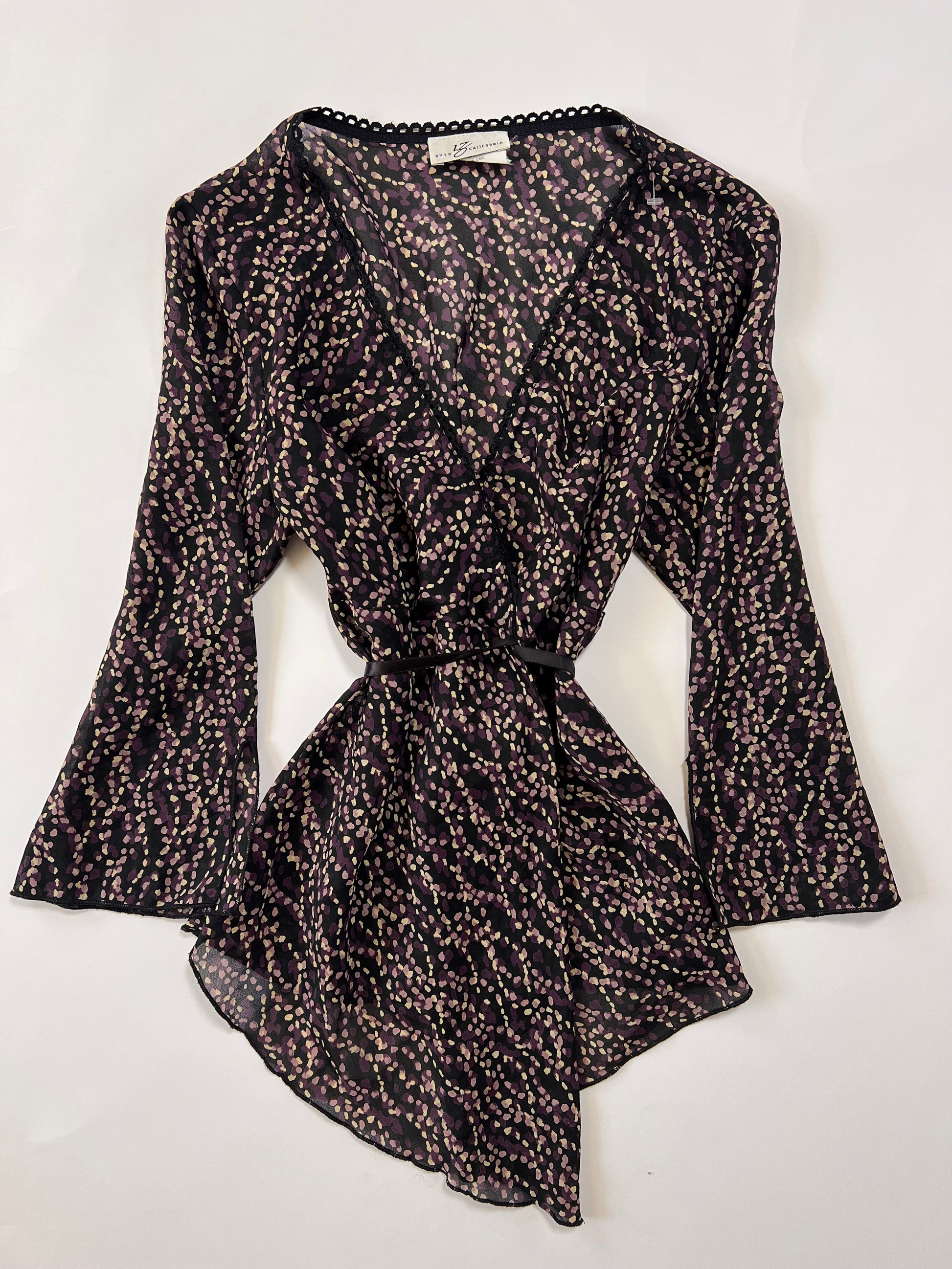 Floral vintage blouse featuring bell sleeves, an asymmetrical V-neckline, and lace detailing. Perfect for layering or wearing alone for a soft boho look.