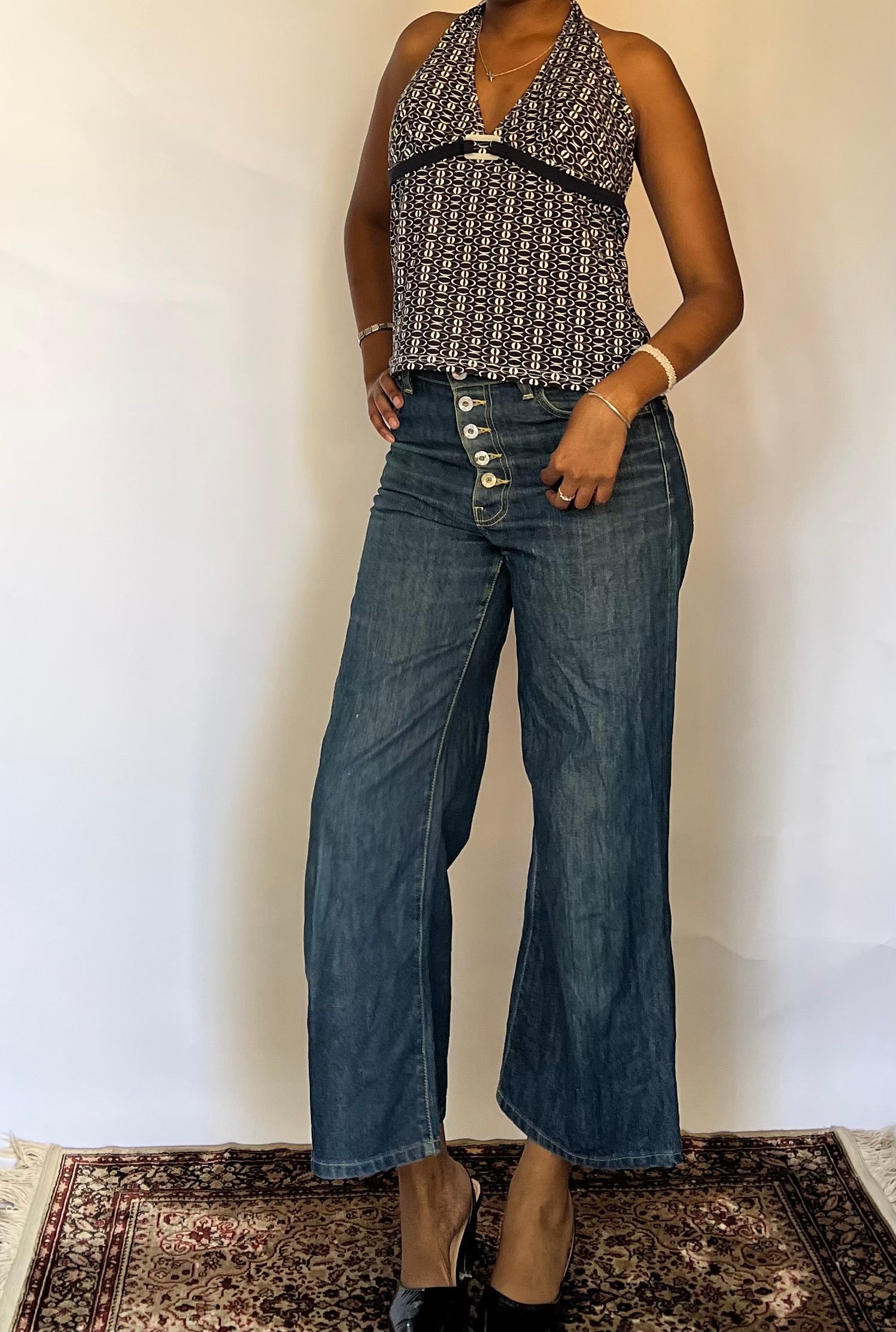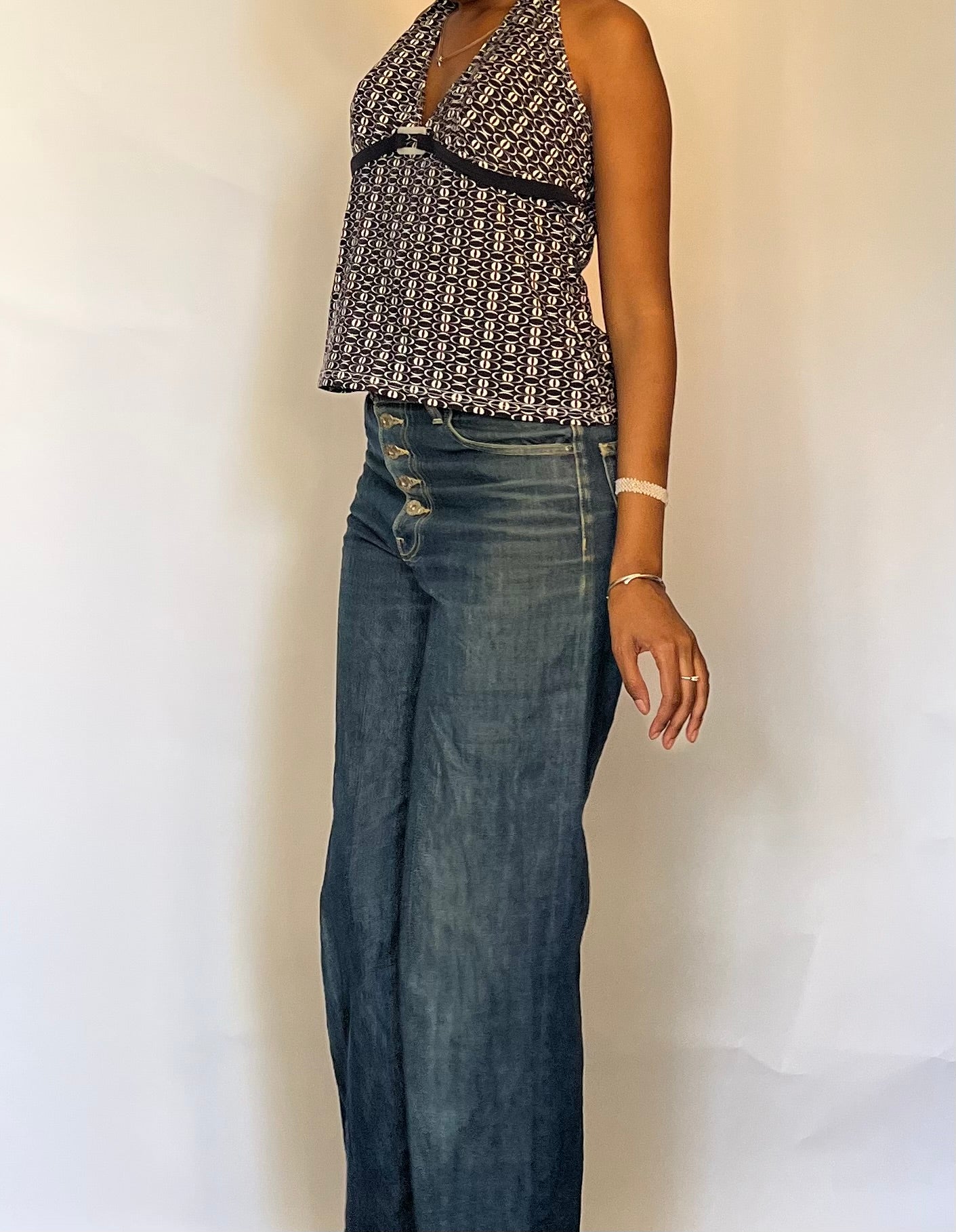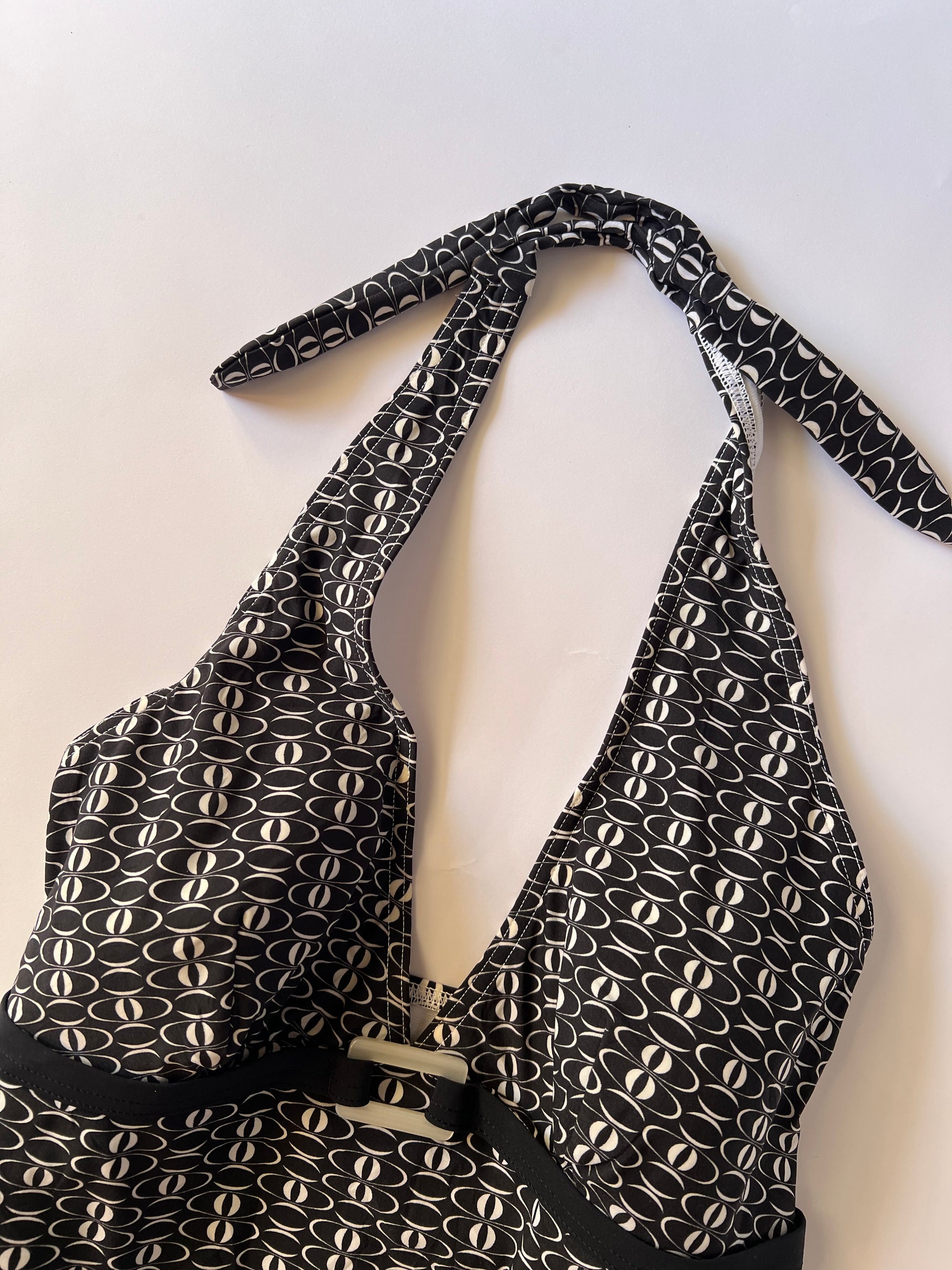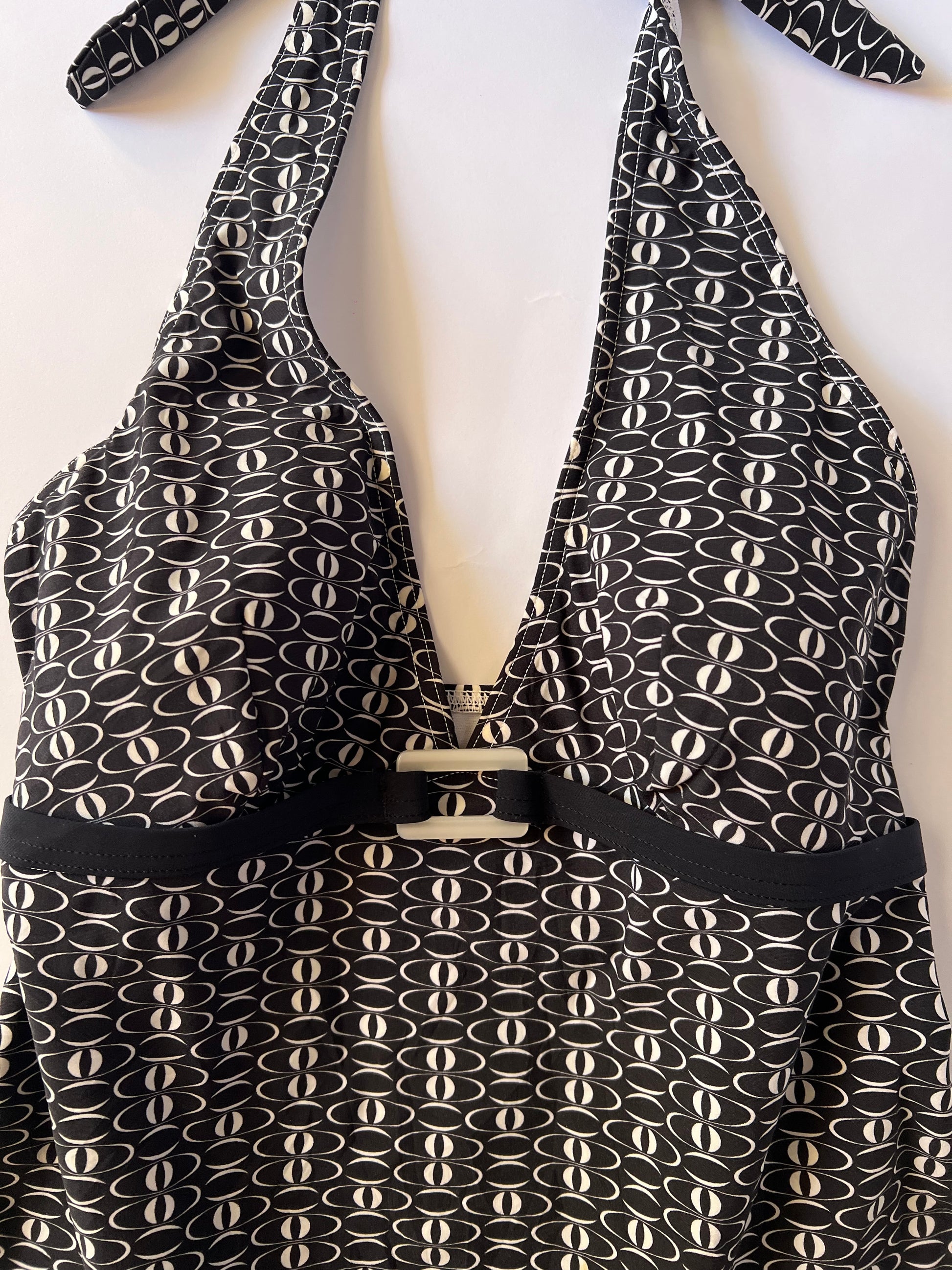 Black and white geometric patterned halter tankini with a flattering, supportive fit. Designed with padded cups for added shape and comfort, and a halter neckline for adjustable support.