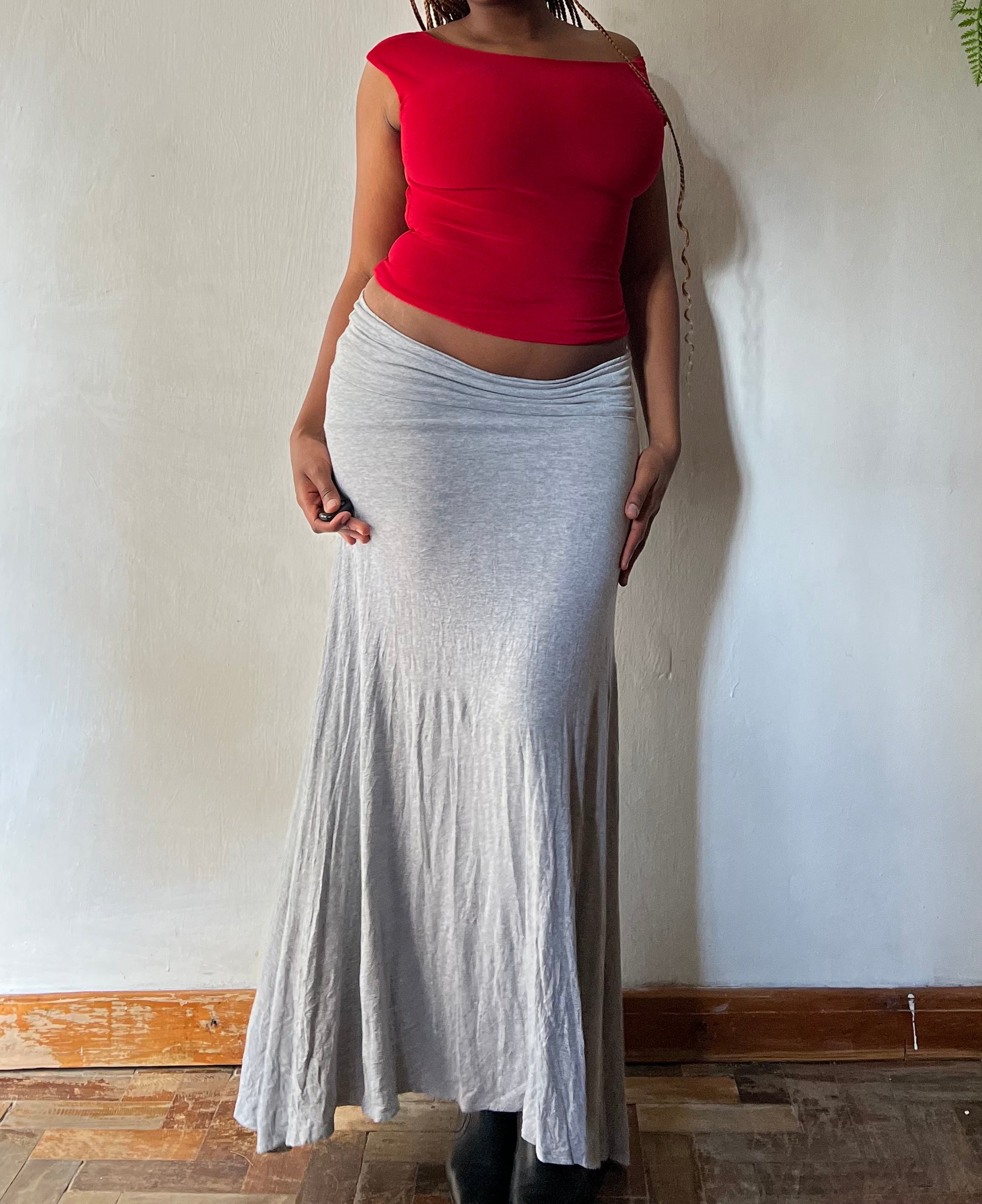 Description: grey jersey maxi skirt with an asymmetrical hem. Very figure flattering.