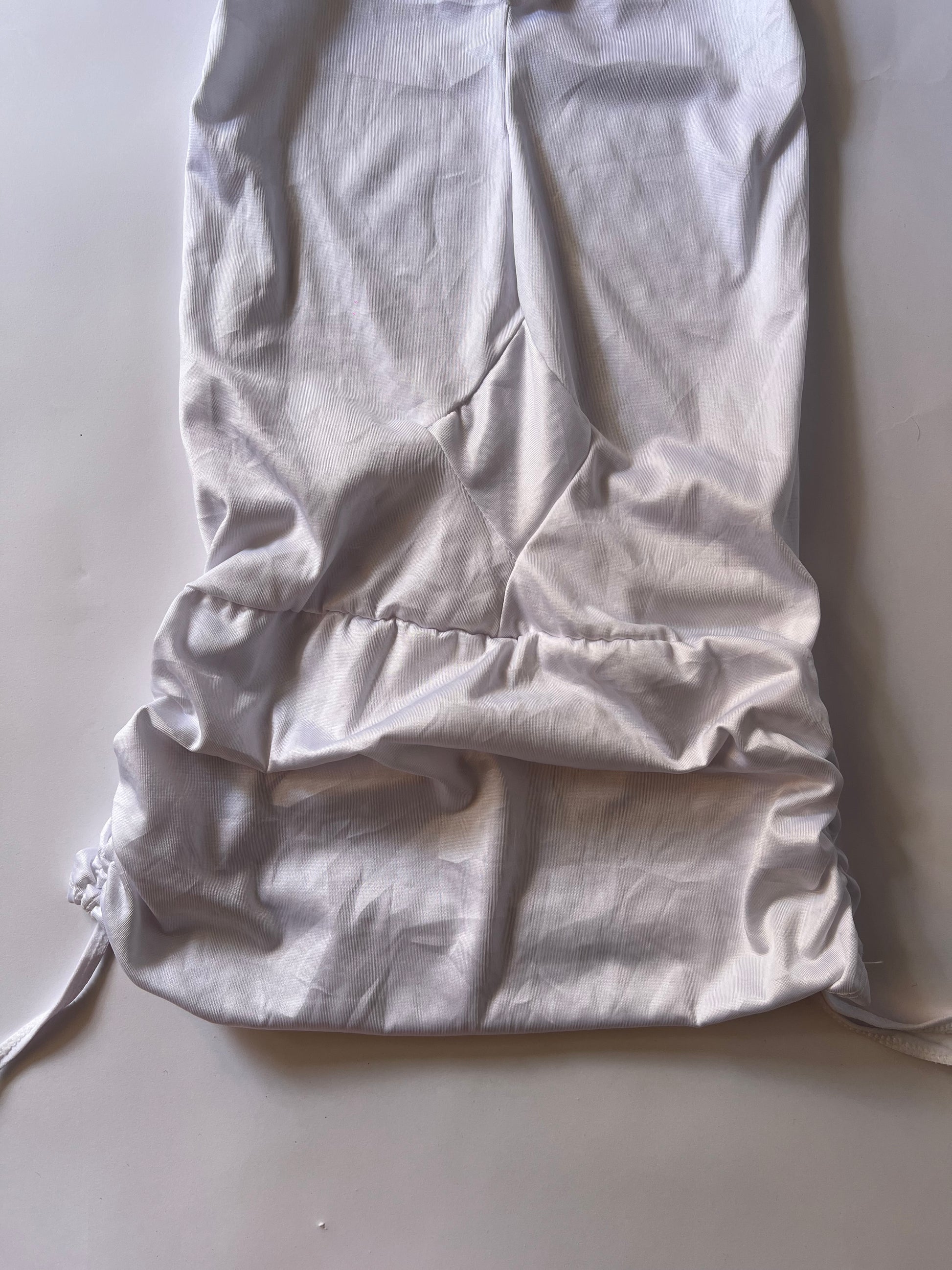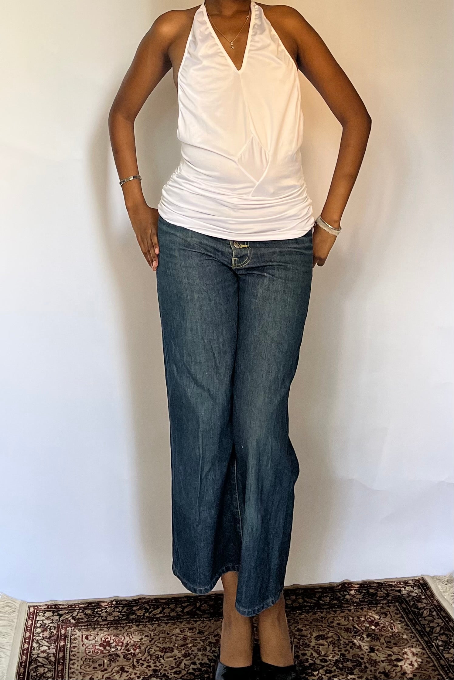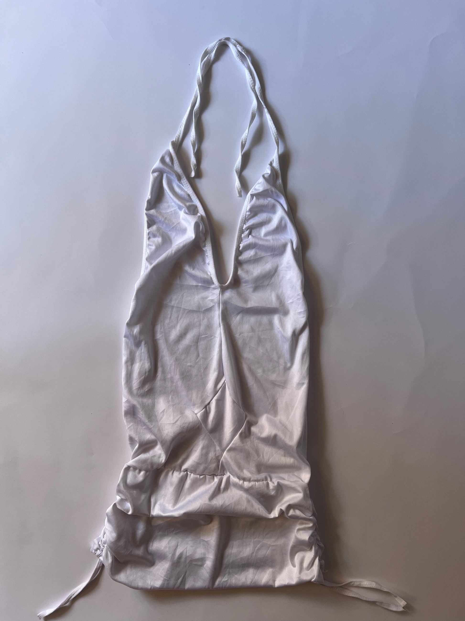 White halter neck top featuring a plunging neckline, side ruching details, and a stunning backless design for a bold, elegant look. Best fits a UK size 6–8