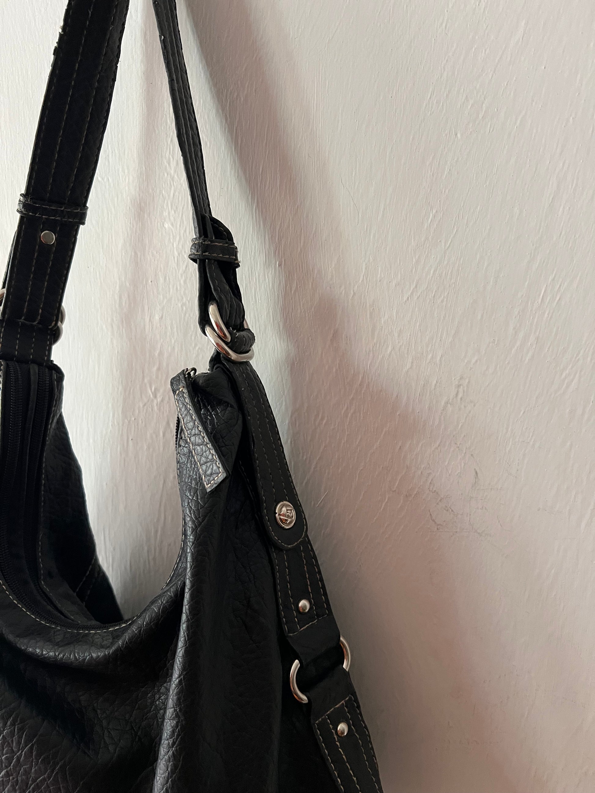 Description: Featured is a genuine leather bag with contrast stitching. The bag has a hobo/ slouchy silhouette and two inner compartments and silver hardware.