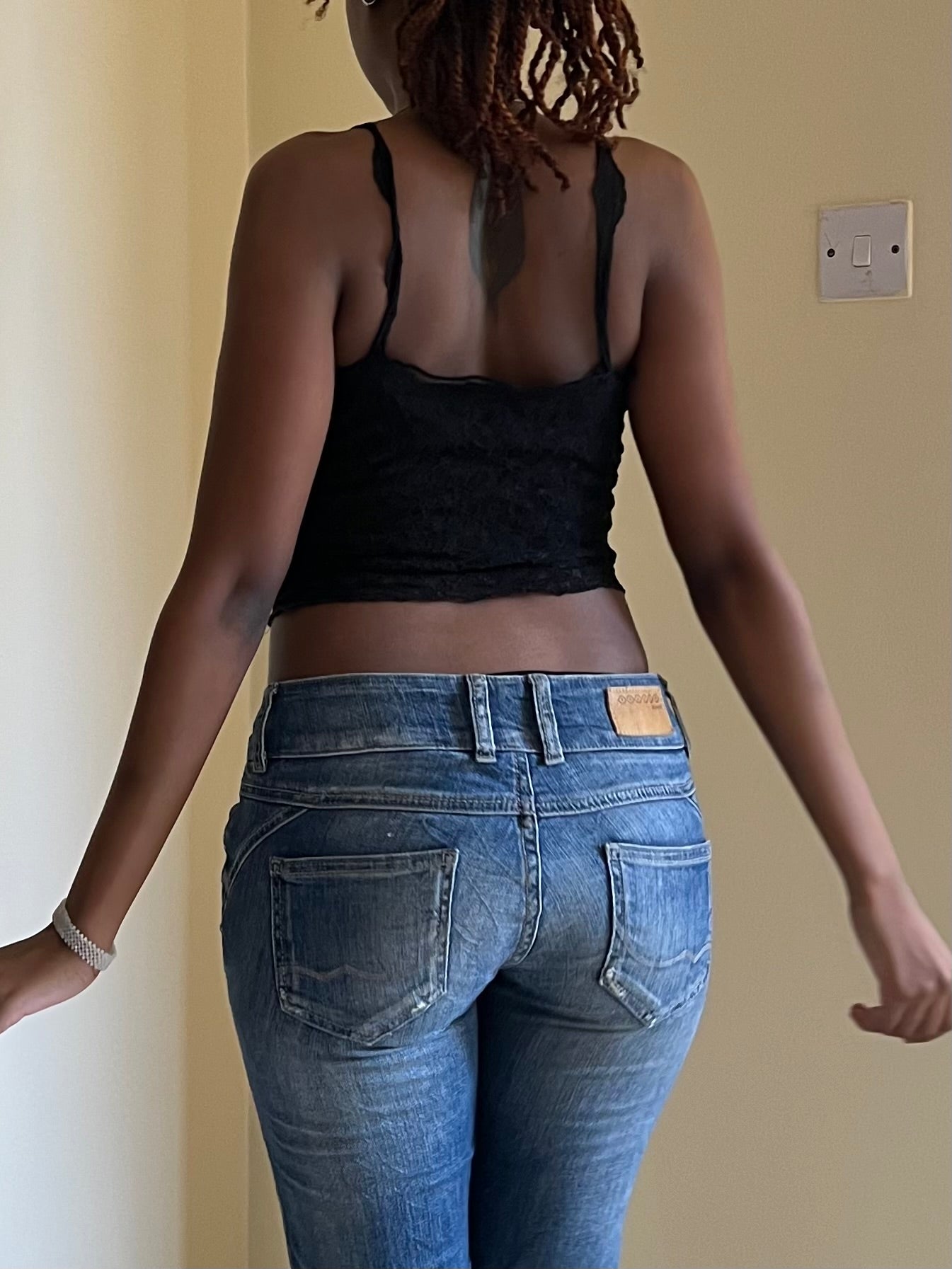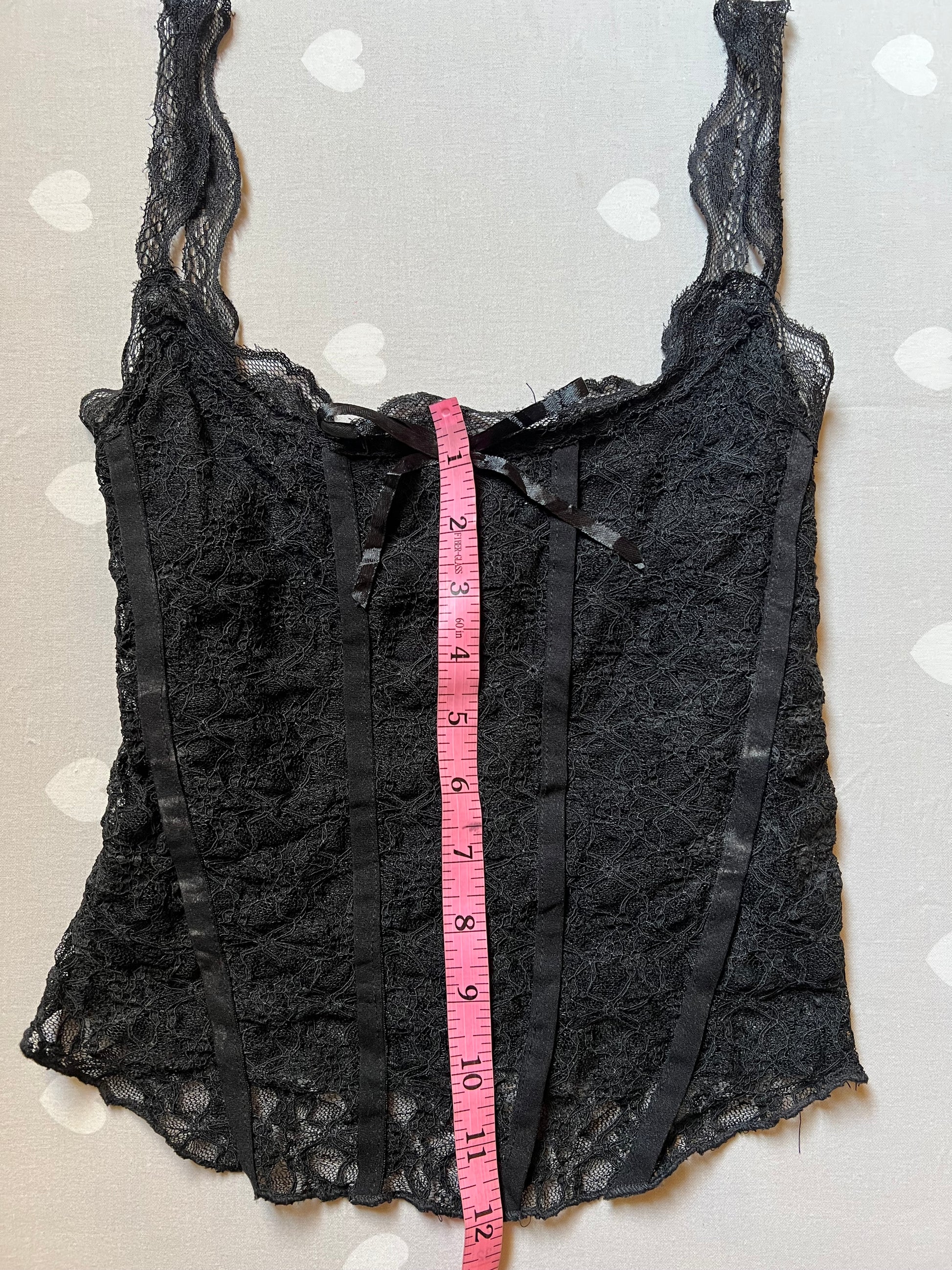 Black lace cami top with corset-inspired construction Size 4/6Bust circumference 30” Shown on a size 6 for reference