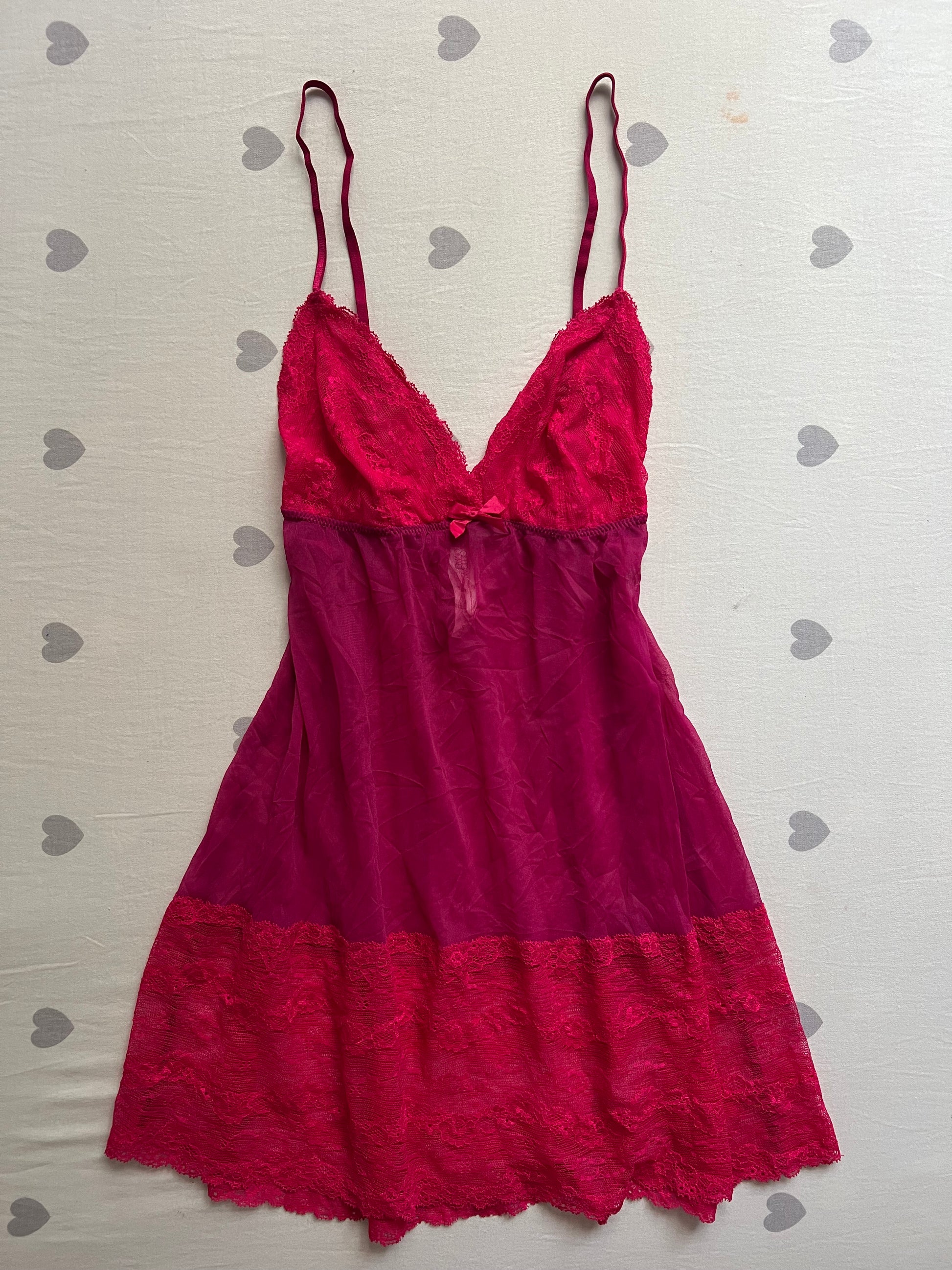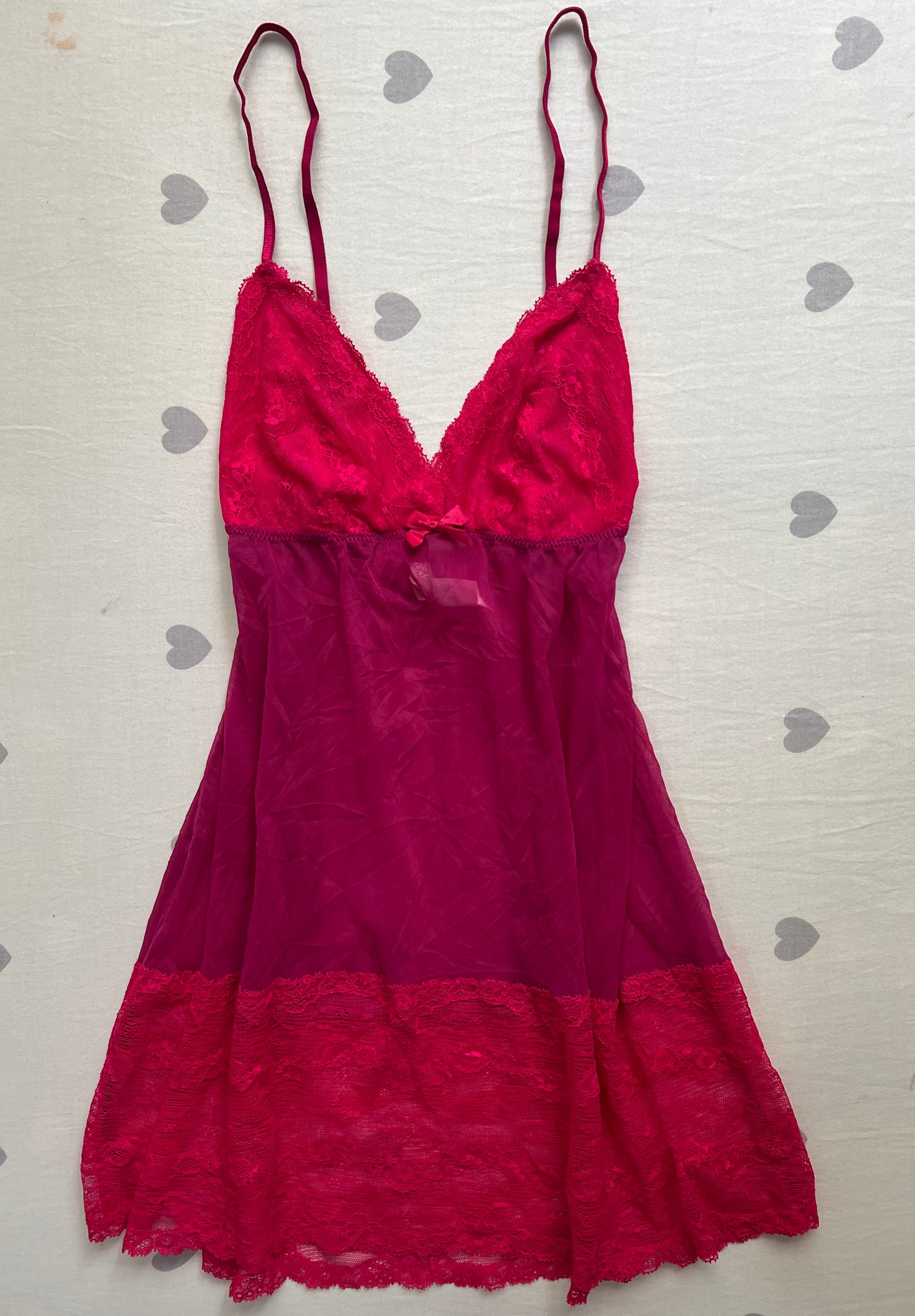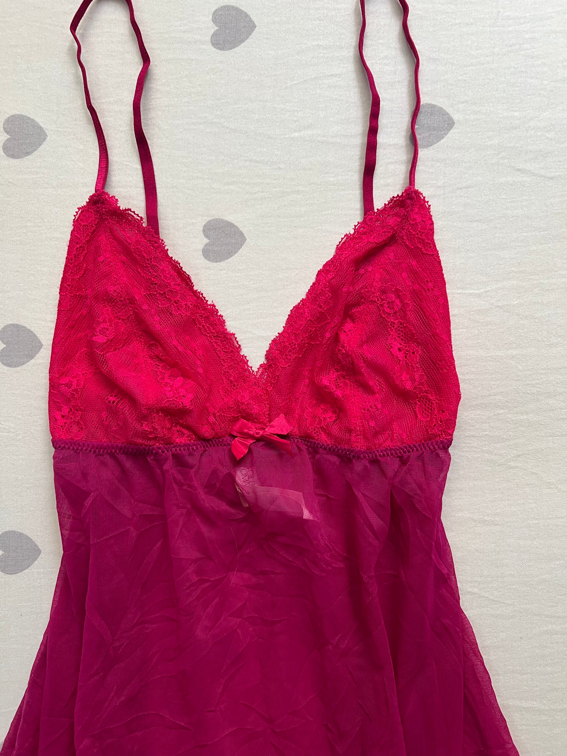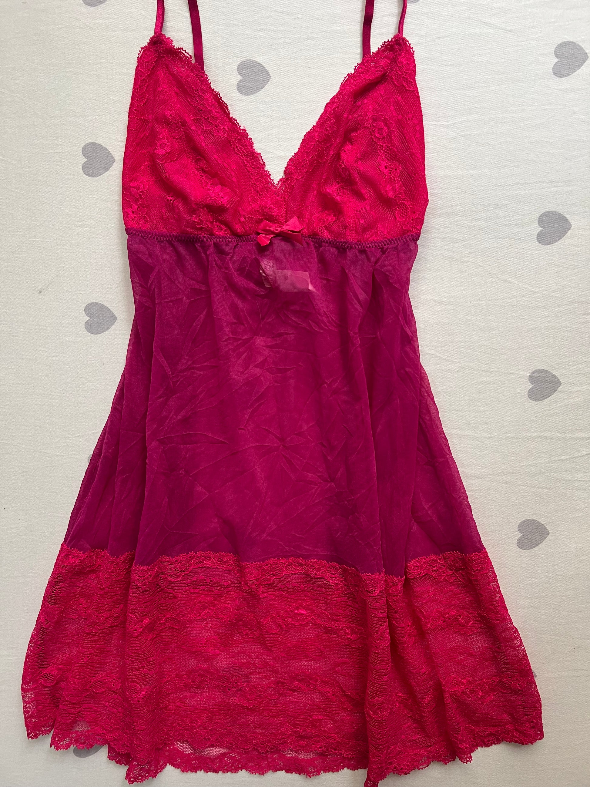 Description: pink baby doll chemise lingerie dress with lace trims. Fits as a dress. Has a flowy silhouette.