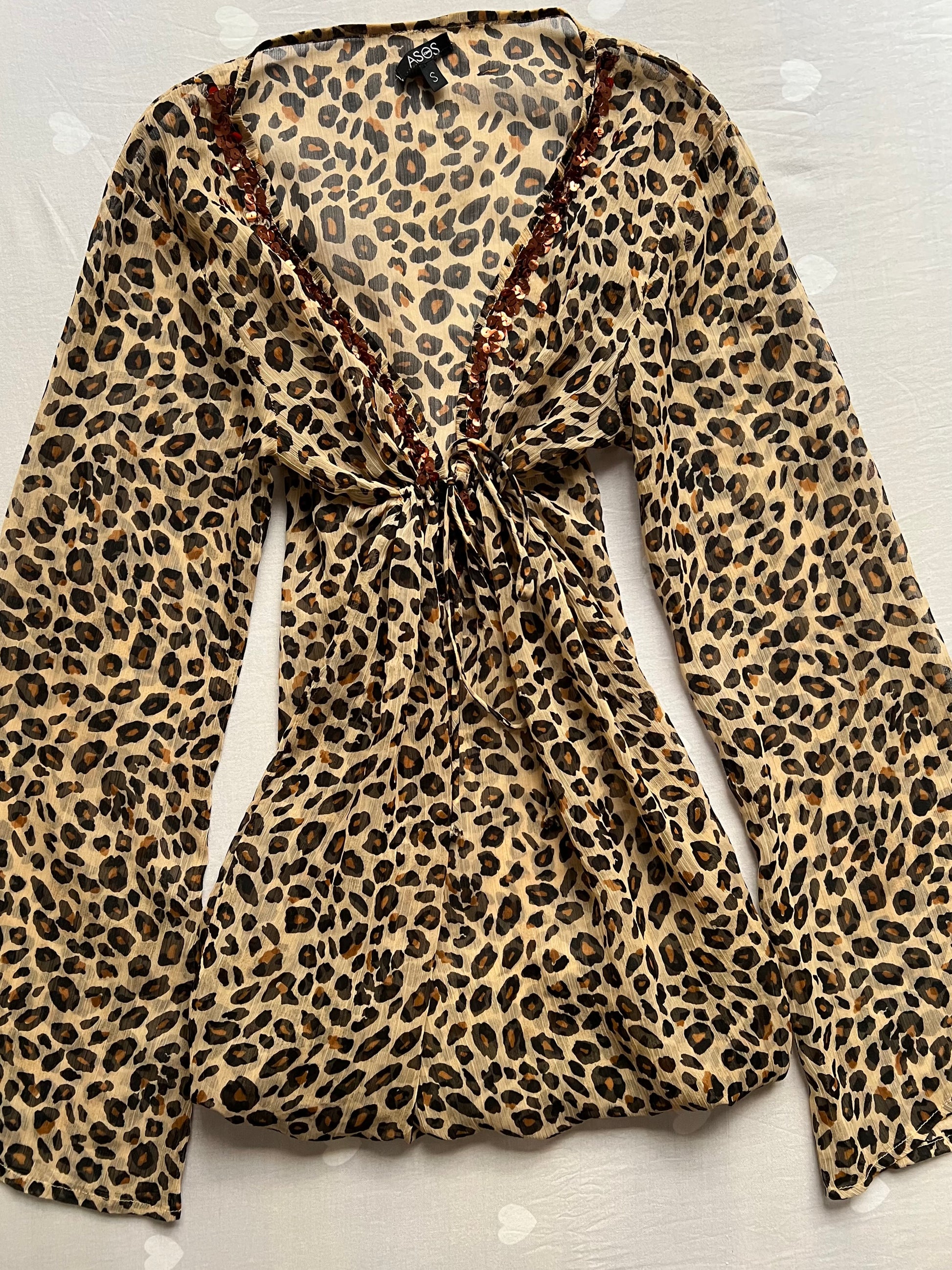 Description: sheer leopard print tunic with bell sleeve details, sequin beading and an adjustable drawstring under the bust for a baby doll/ flowy look