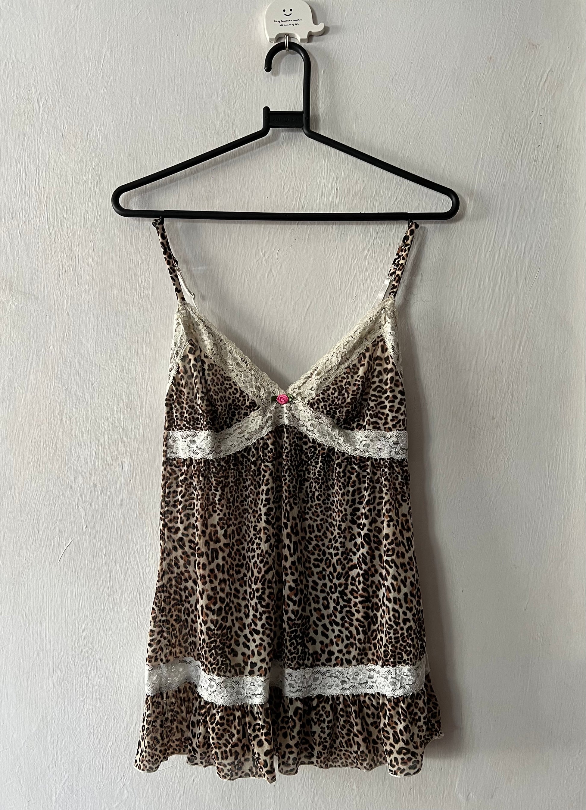 Leopard print mini dress with delicate white lace trim. Perfect for a bold y2k look in size 10/12.