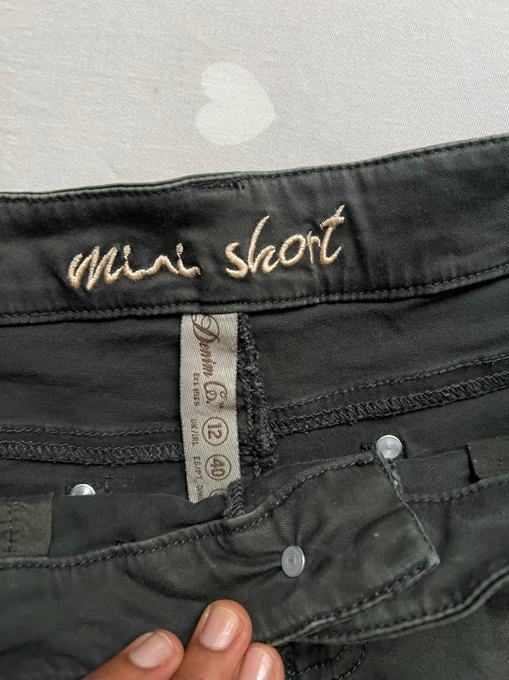 Green low rise denim shorts with studded detailing and a frayed hem