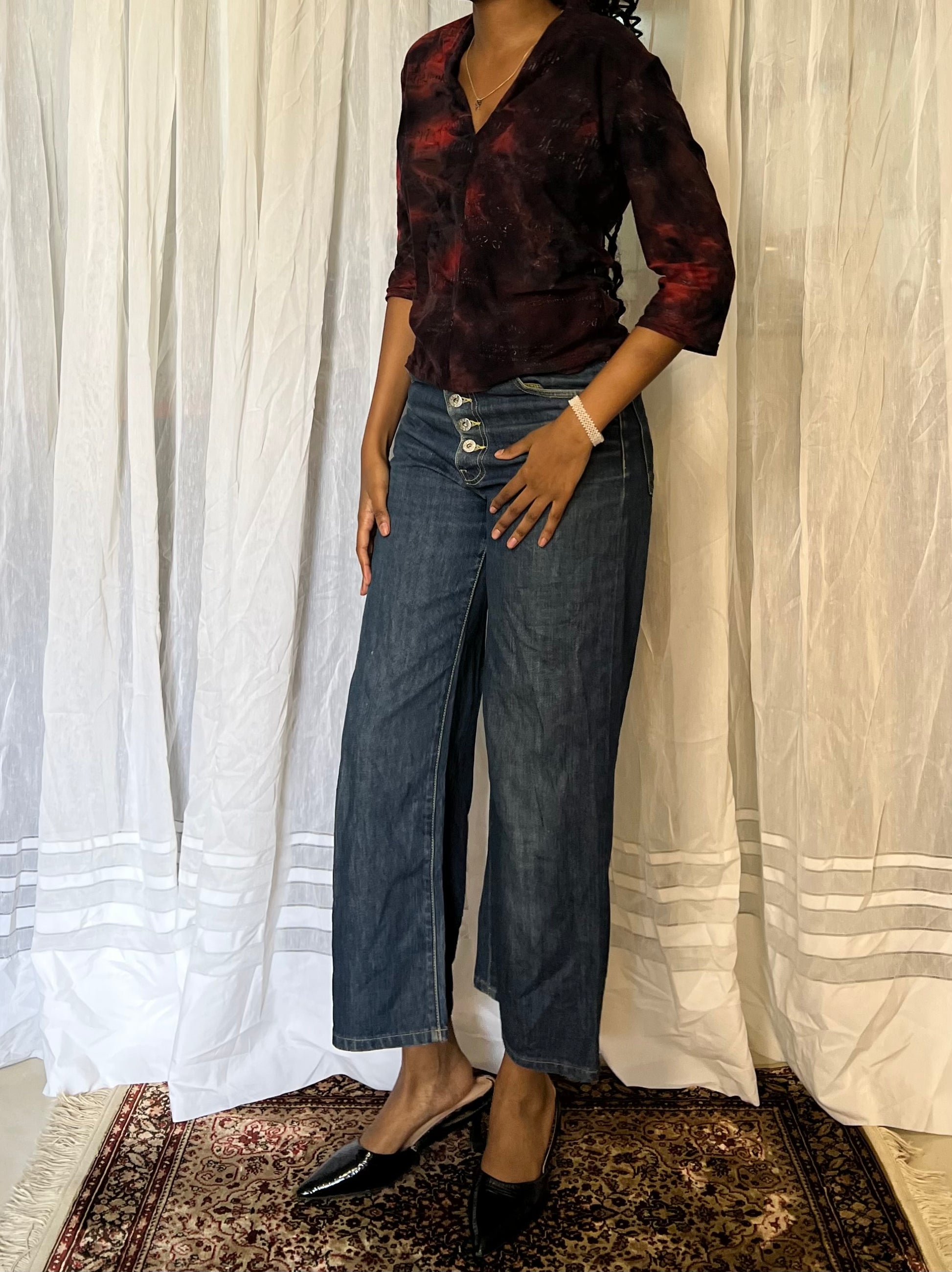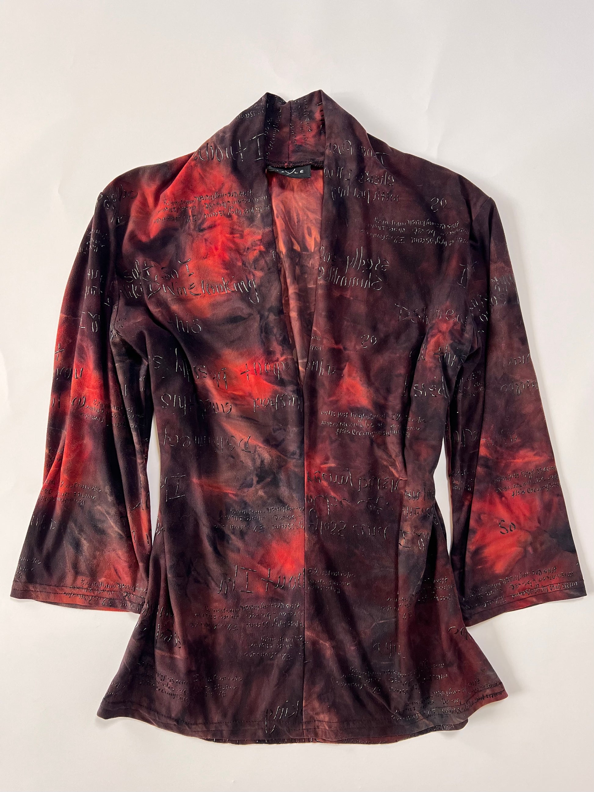 Graphic tie-dye top with striking red-and-black tones and statement graphic writing. Bold, expressive, and effortlessly cool.