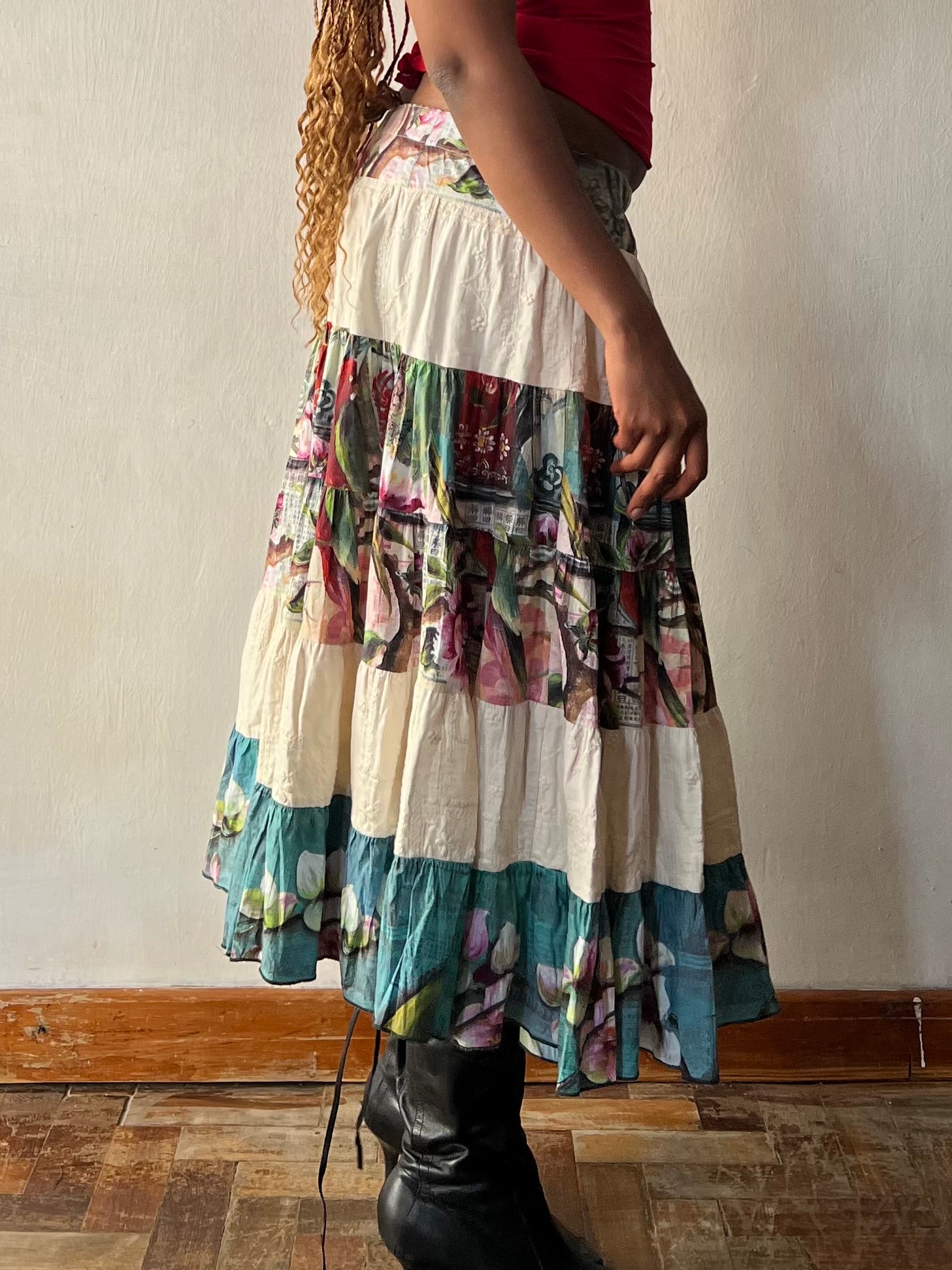 Description: tiered bohemian patchwork maxi skirt with a flowy A-line silhouette featuring floral and parrot prints
