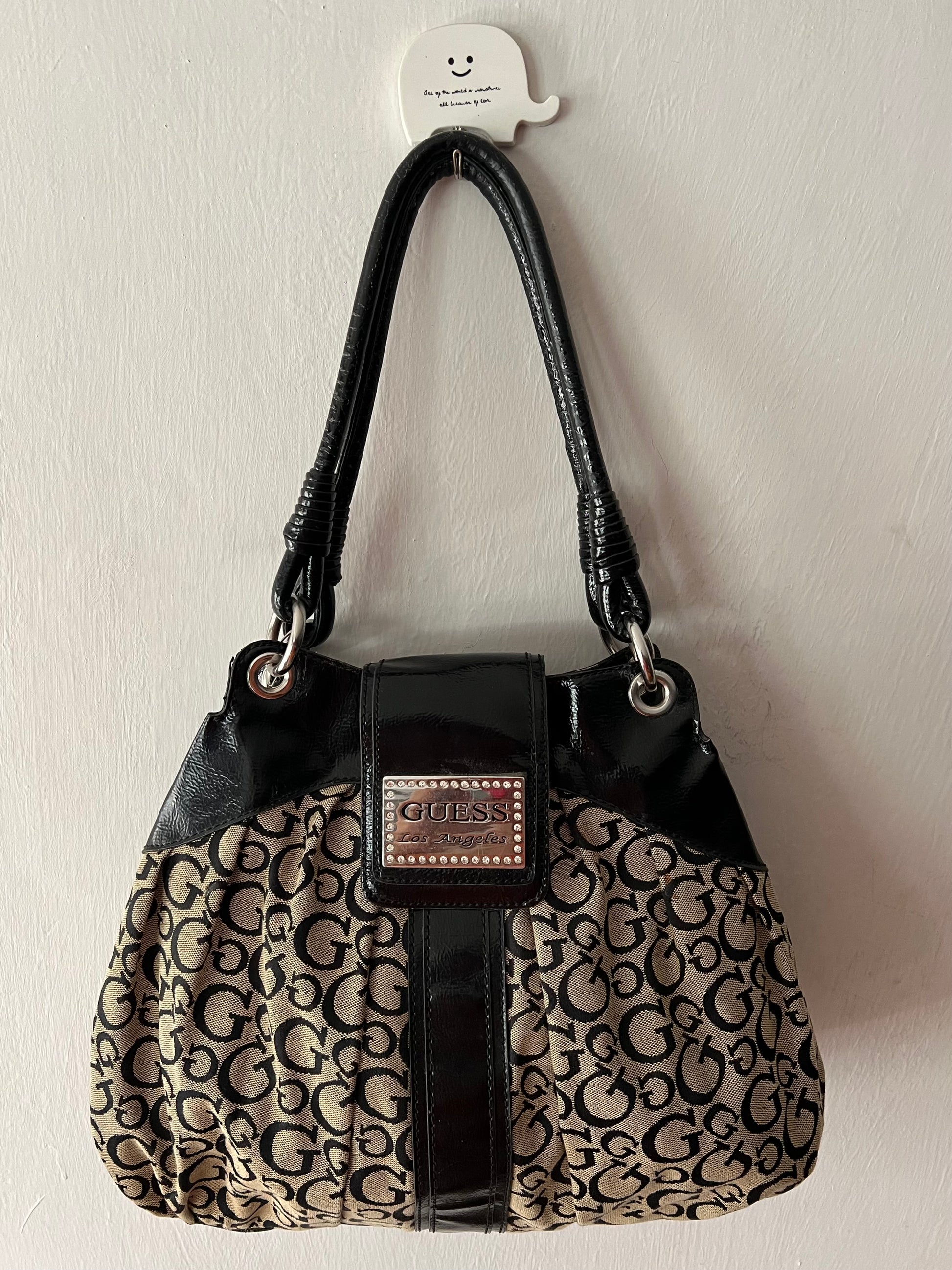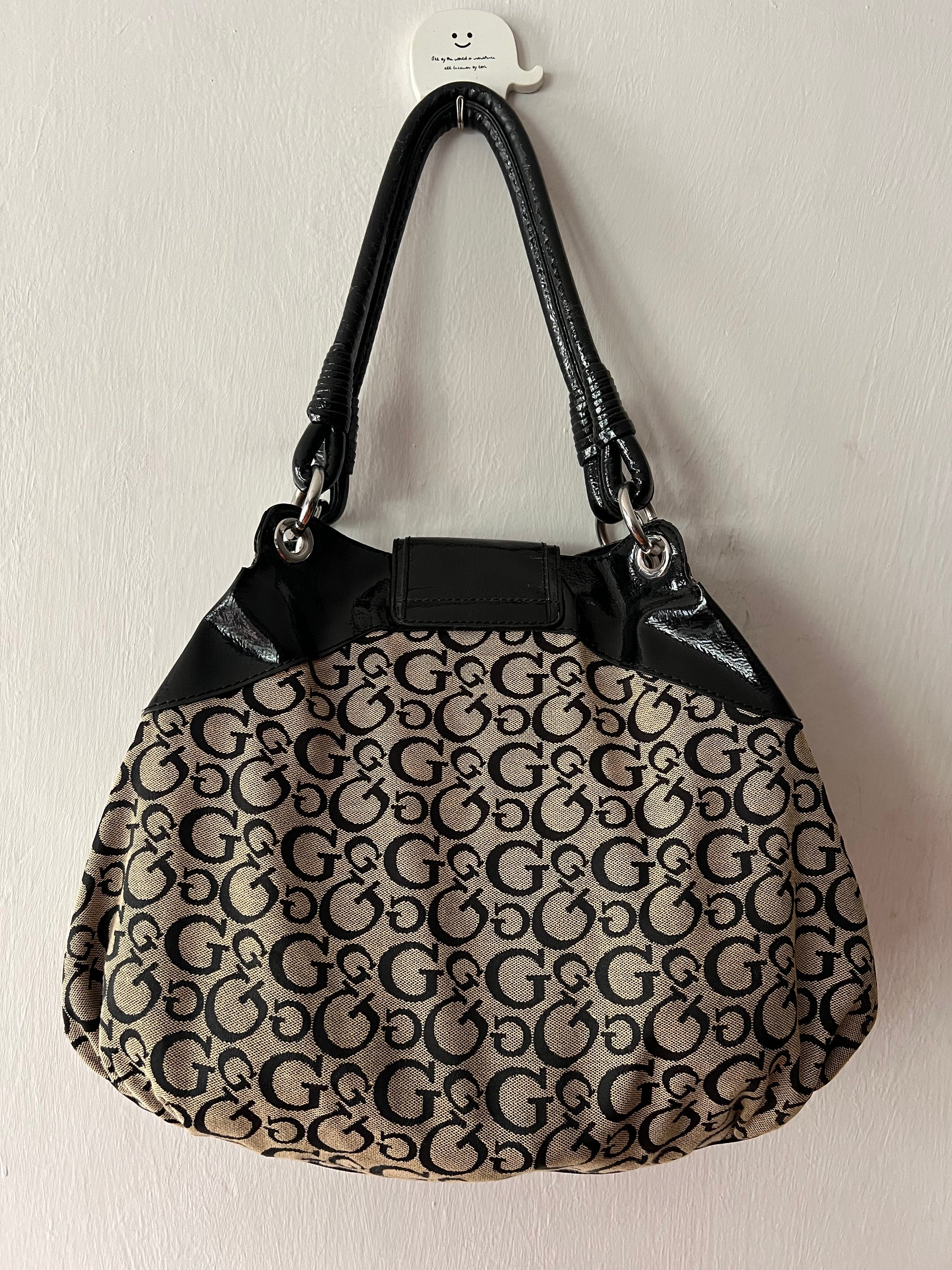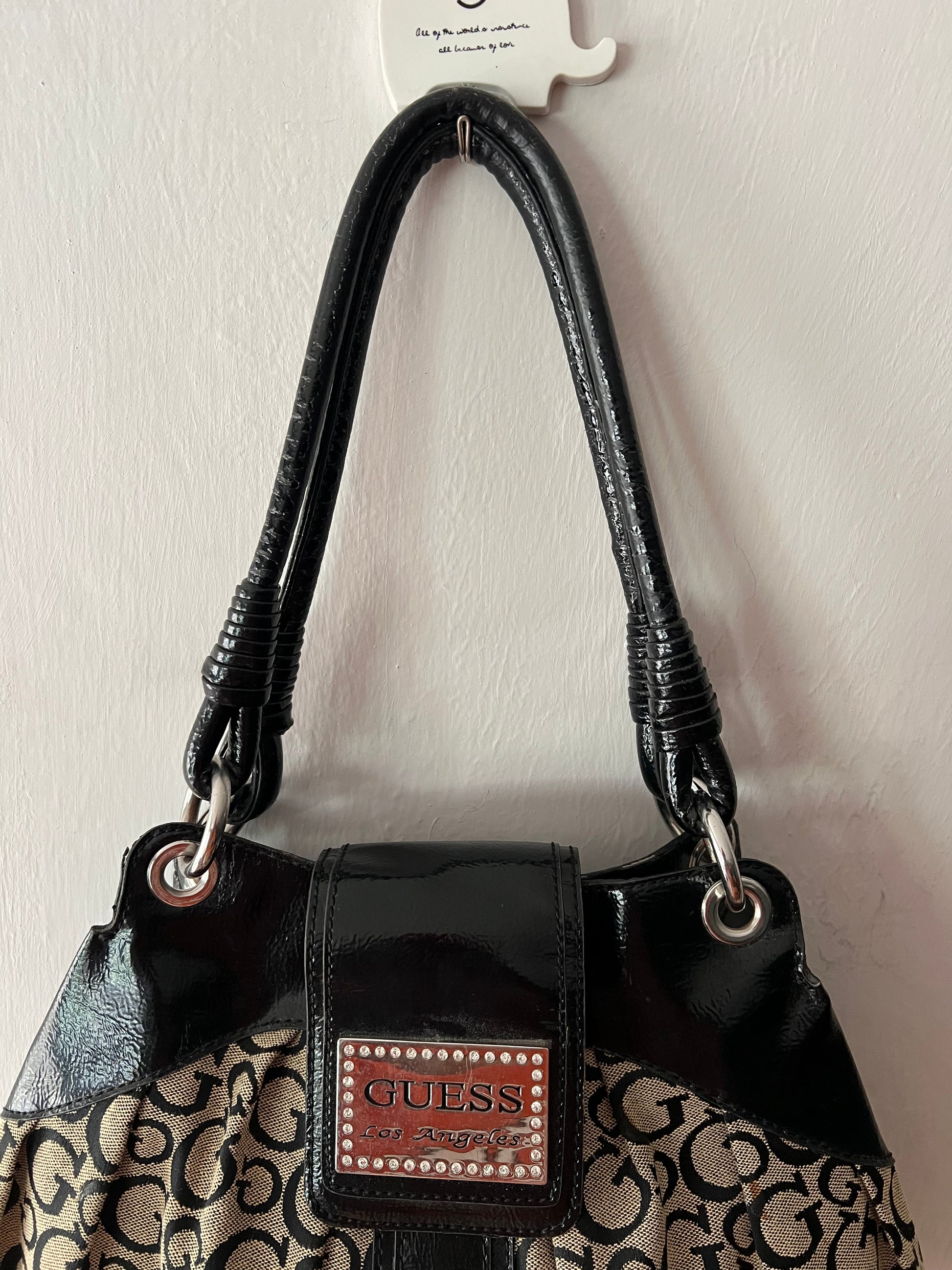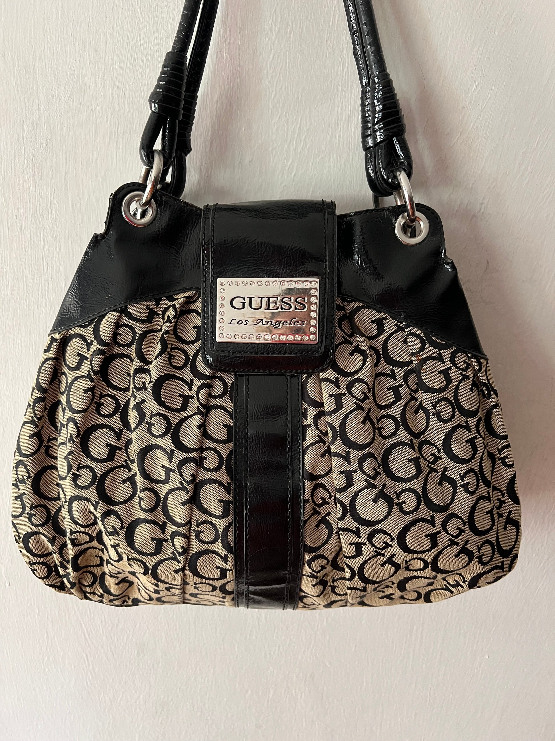 Description: Featured is a vintage Guess satchel handbag with the iconic guess logo. Features include a flap closure, silver tone hardware and double handles. The bag has one large compartment with side pockets. The bag has a very small rust stain that near the strap that is negligible.(see last slide)