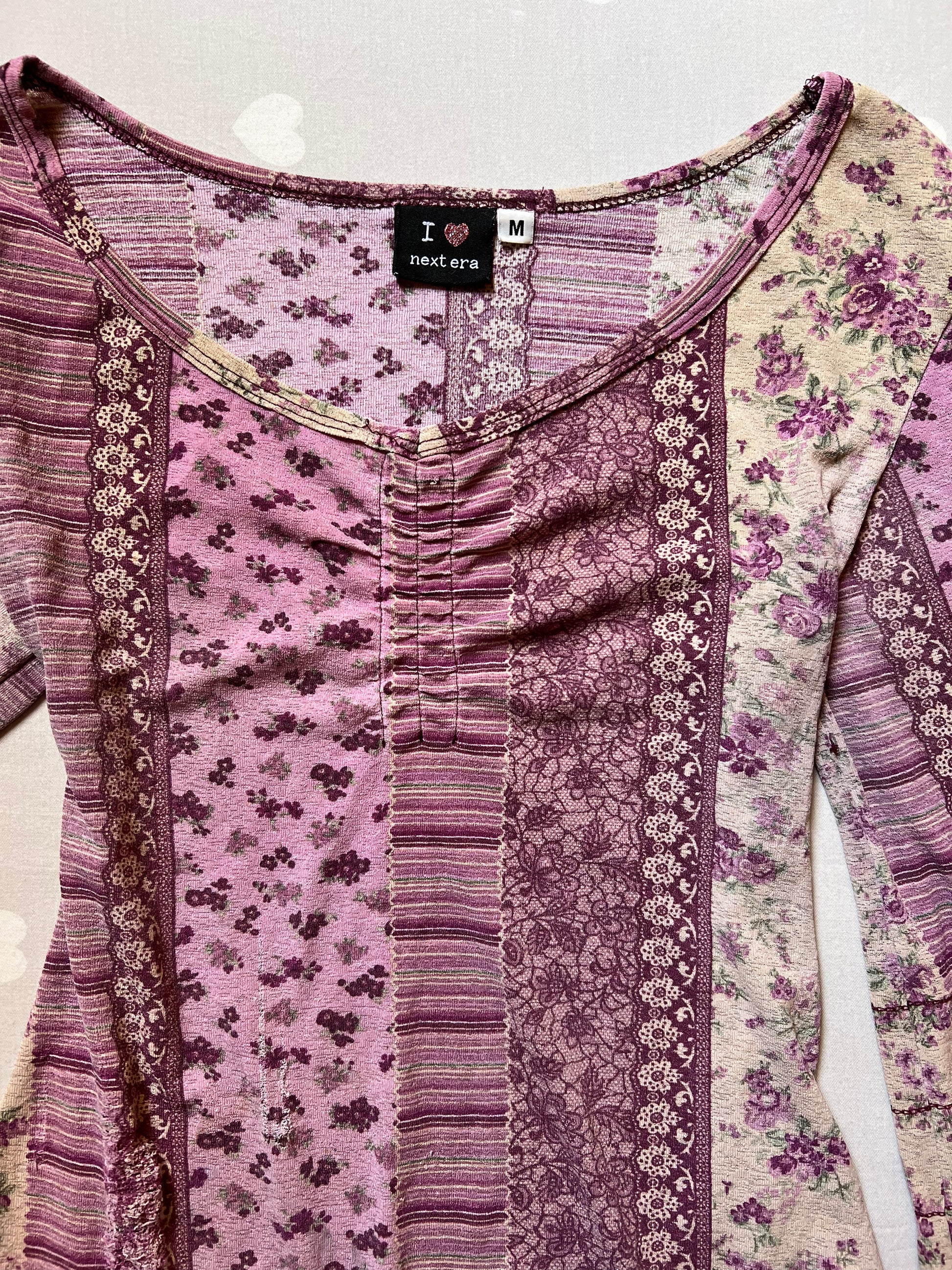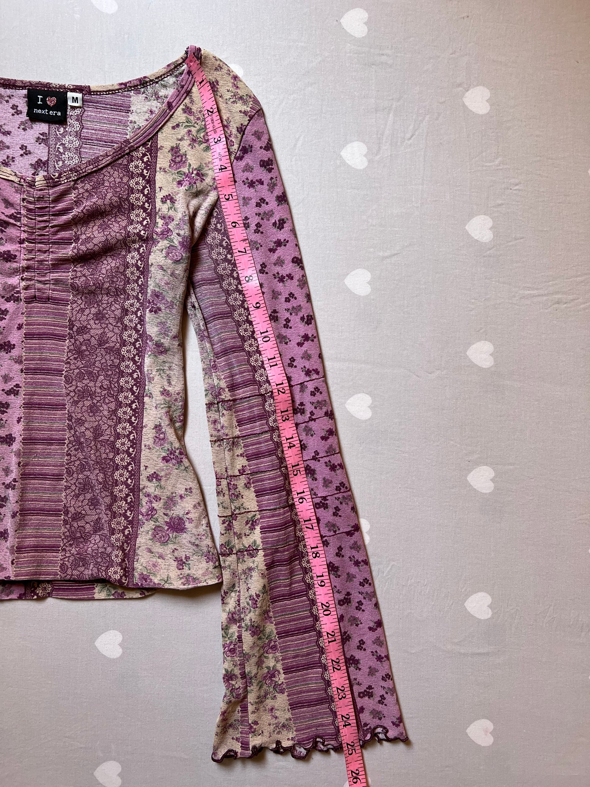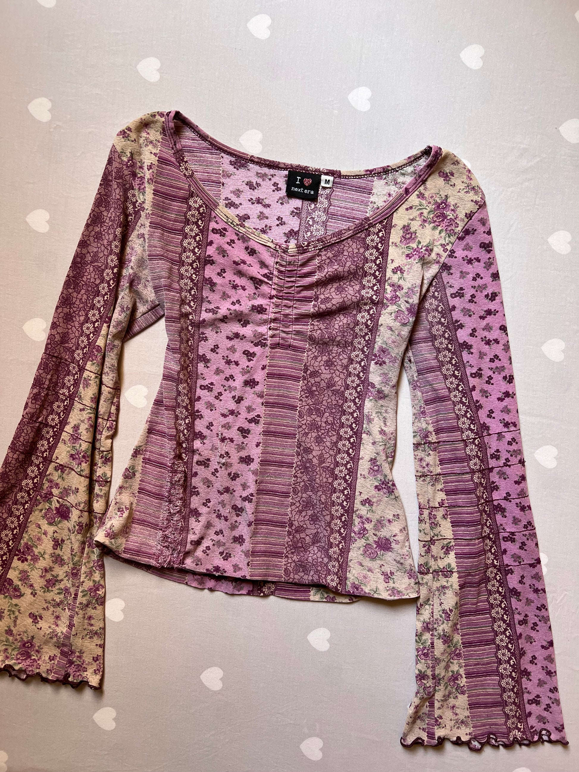 Lovely floral fairy core long-sleeve top with romantic bell sleeves, a soft V-neckline, and a flattering ruched bust