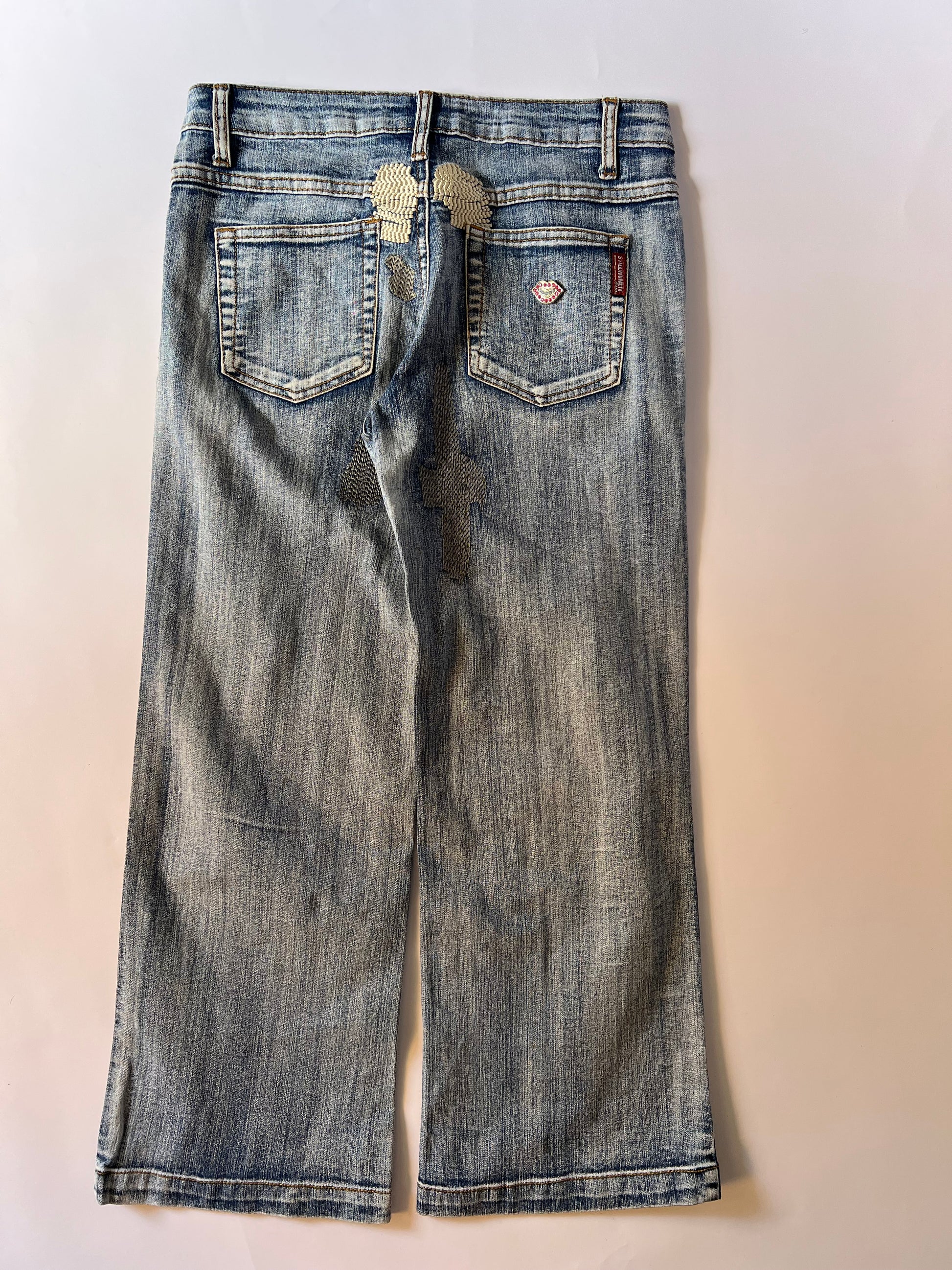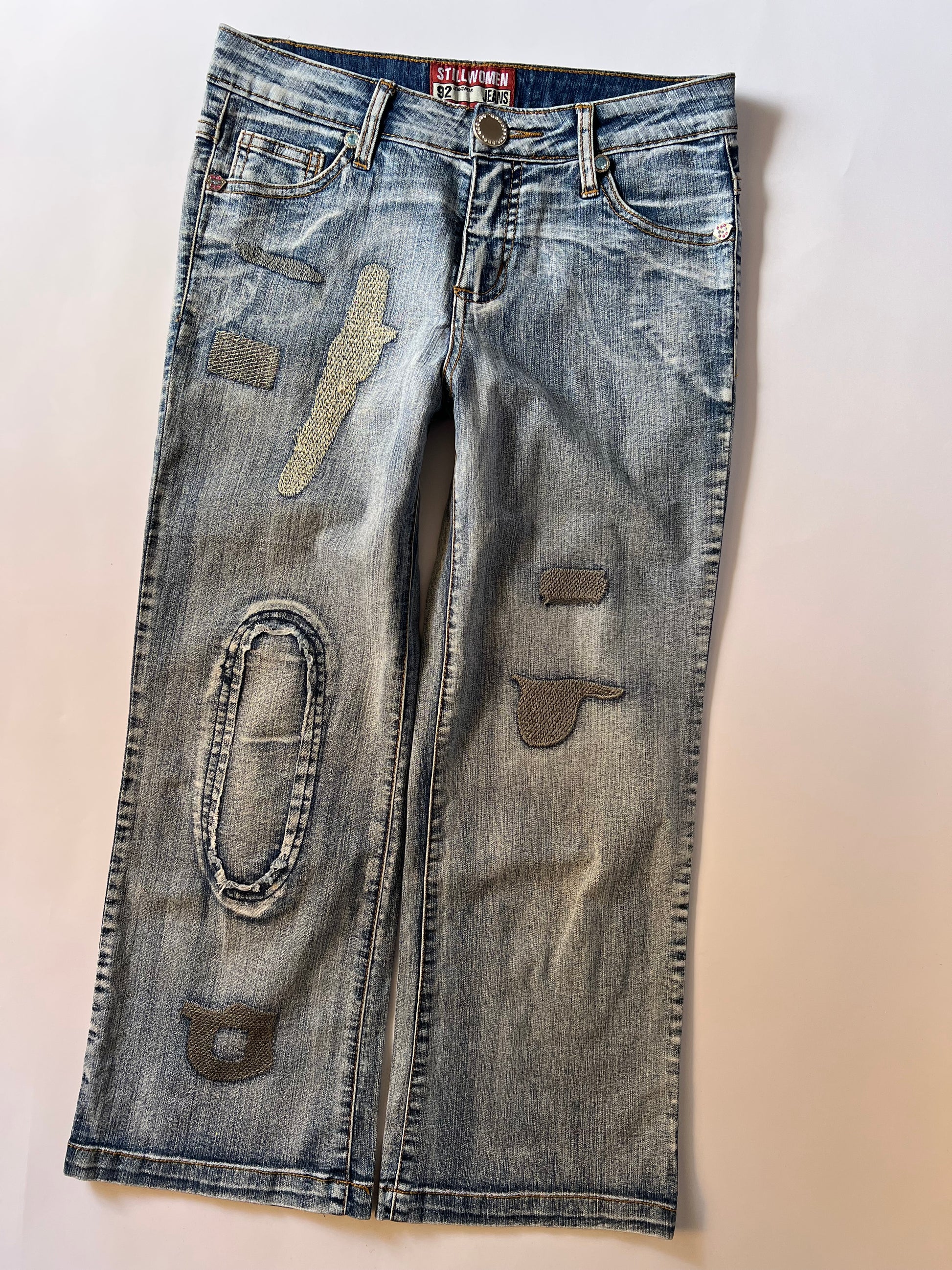 Distressed capri pants with unique patchwork details and a subtle flared leg for added shape and edge. Measurements:Waist: 28”Hips: 32–34”Length: 32”Inseam: 24” Best suited for heights 5'4" and below for a perfect capri fit.